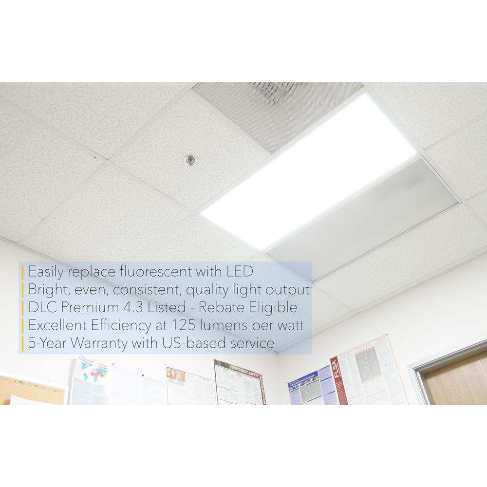 LED 2 x 4 ft. Panel Troffer Light is bright at 6240 Lumens with 125 Lumens with efficiency using high-performance LED edge-lit technology which produces great quality light output and uniformity. Easily installs into T-Bar ceilings. Great for offices, schools, hospitals, car dealerships and convenience stores. ETL and DLC Premium 4.3 listed for quality and eligible for energy rebates.