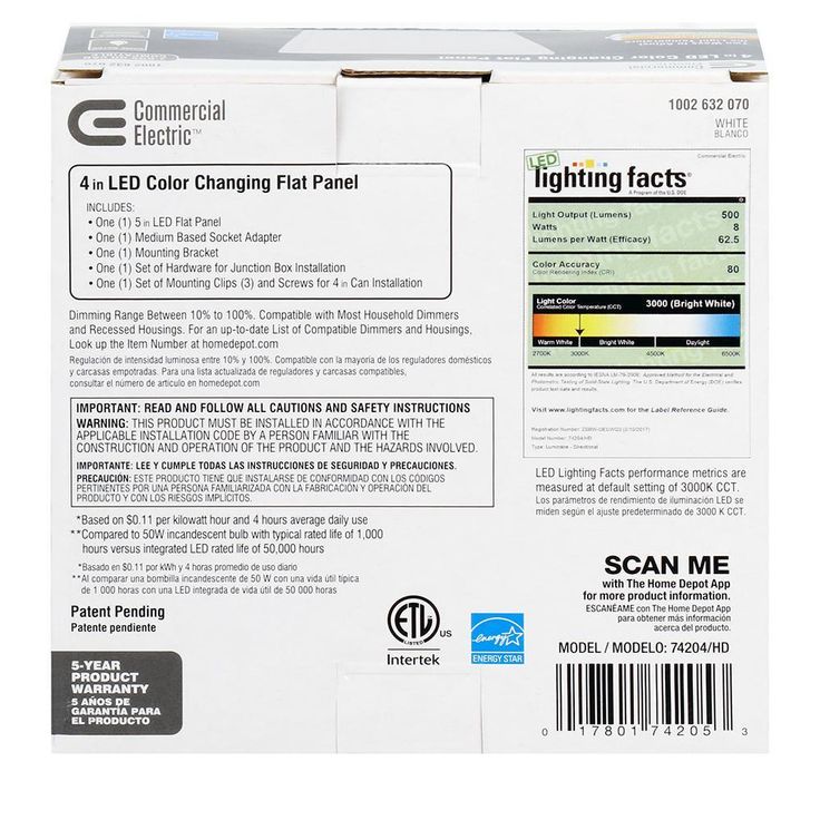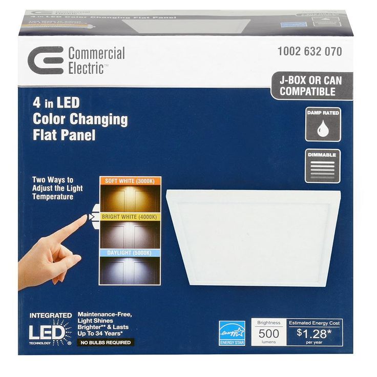 Experience the versatility and efficiency of Commercial Electric's 74204/HD/4 4-Pack 5 in. White Square LED Energy Star Flat Panel Ceiling Fixture. With its ultra thin design (less than 1 in.), this fixture is perfect for low ceiling areas and features integrated no-glare, edge-lit LED's that eliminate the need for bulb replacements. Easily set your desired light color temperature - soft white, bright white, or daylight (3000/4000/5000K) - with the selectable color switch, or simply toggle between temperatures using a standard light switch. Plus, this fixture only uses 8-Watt of electricity and is up to 80% more energy efficient than traditional incandescent bulbs, producing even light distribution with 500 lumens. Ideal for both flush mount and retrofit kit applications, this long-lasting fixture has an average lifespan of 50,000-hours/45.7-years and can be mounted on either the ceiling or wall.