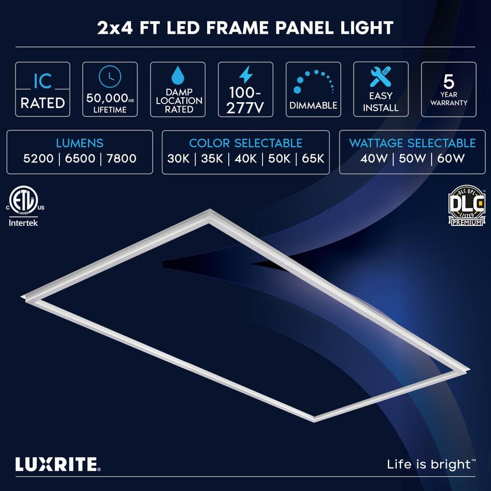 LUXRITE 2 ft. x 4 ft. Frame LED Panel Lights, 5CCT, 5200/6500/7800 Lumens, 40W/50W/60 Watt, Dimmable, Damp Rated, ETL 4 Pack