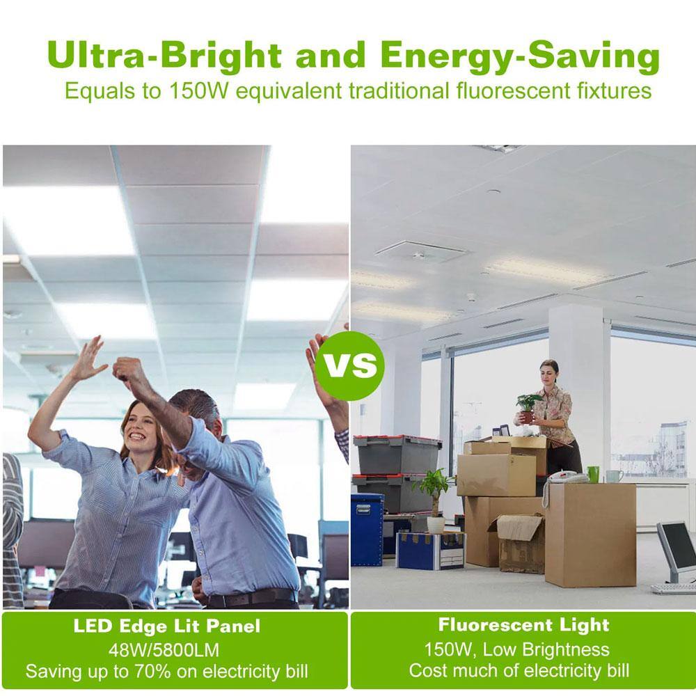 A: The LED panel operates at 48 watts while providing equivalent brightness to a traditional 150-watt fluorescent light, helping users save up to 70% on electricity costs.