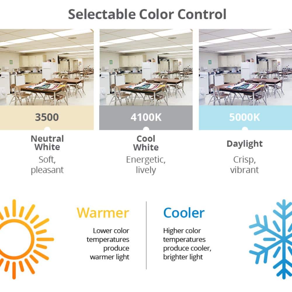 A: With selectable color temperatures of 3500K, 4100K, and 5000K, these panels are excellent for varied lighting needs, from warm to cool environments.