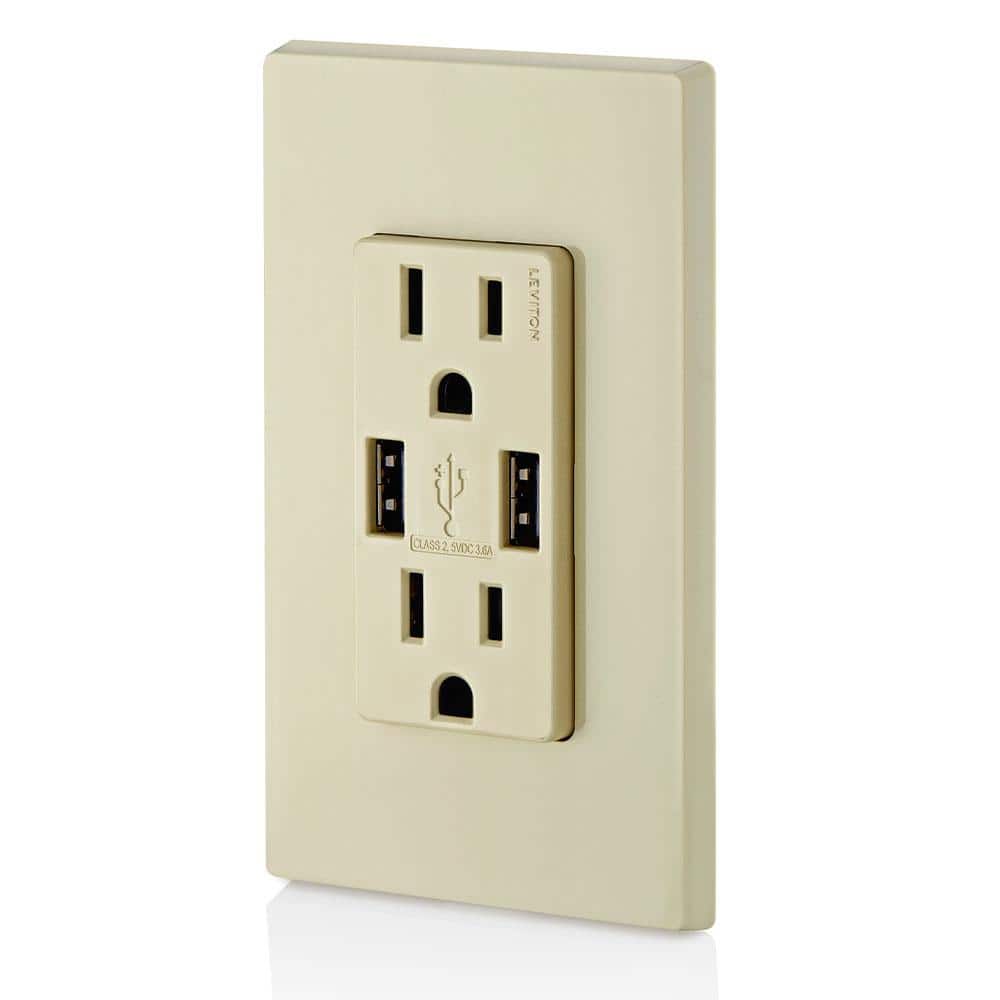 Leviton 3.6A USB Dual Type A In‑Wall Charger with 15 Amp Tamper-Resistant Outlets, Ivory