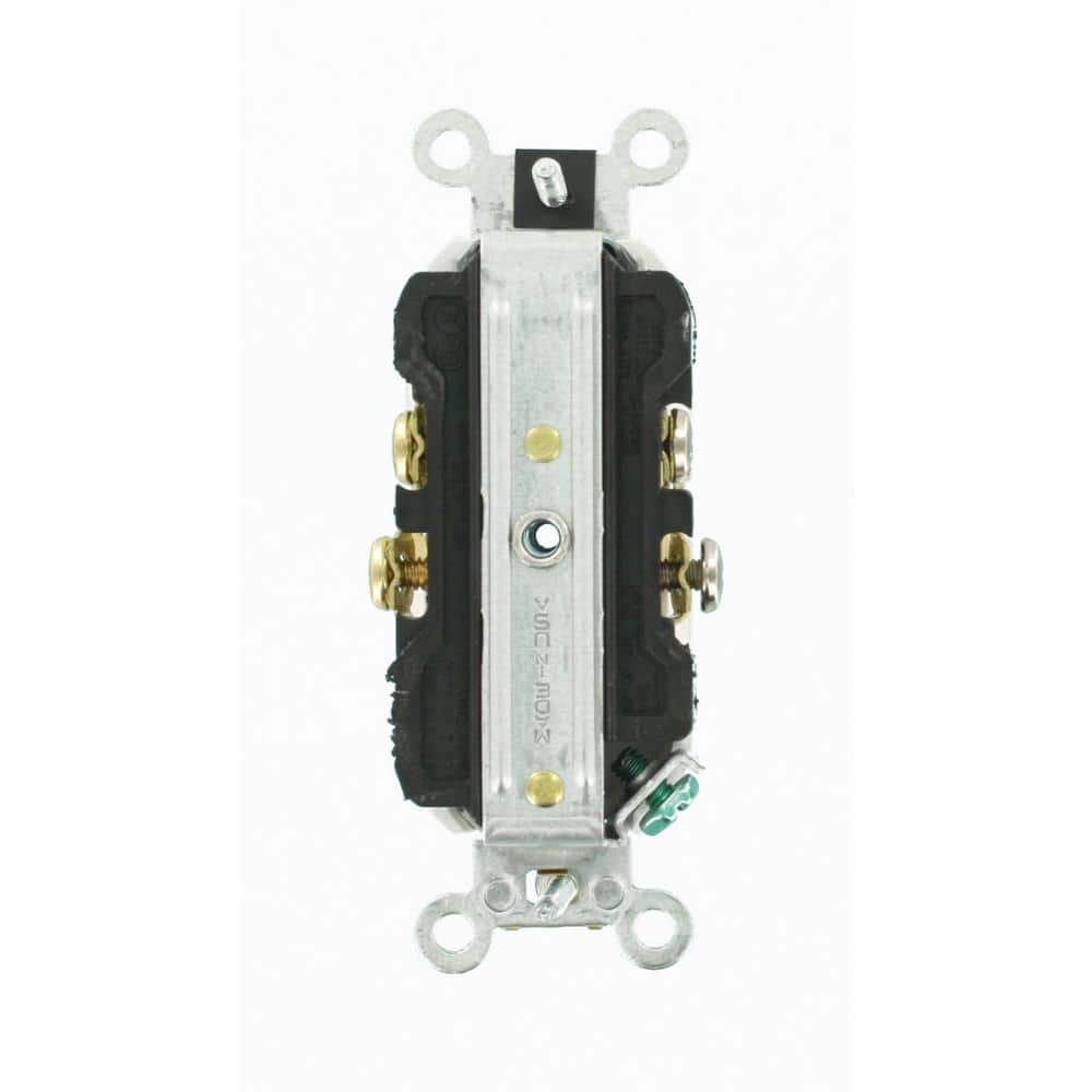 Durable Leviton commercial-grade duplex receptacle for 15A, 125V circuits. Designed for reliable plug retention and easy in-wall installation in high-traffic environments.