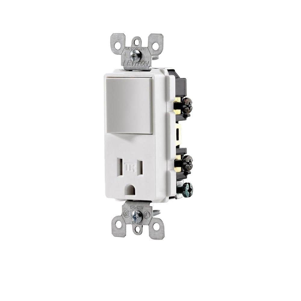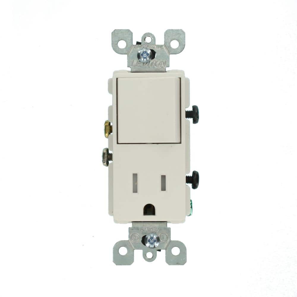This Leviton Decora combination device pairs a single-pole switch with a tamper‑resistant 5‑15R outlet in one sleek unit, saving wall box space. Built with impact-resistant thermoplastic and grounded for safety, it offers either switch-controlled or constant power to the receptacle.