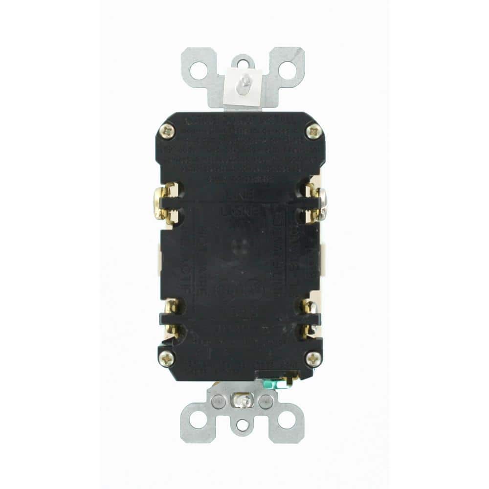This Leviton SmartlockPro SmarTest GFCI duplex outlet provides 15A, 125V ground-fault protection with continuous self-testing for reliable safety. Its slim, tamper-resistant design installs easily in standard or shallow boxes and complements Decora wall plates in Light Almond.