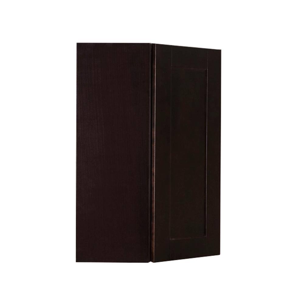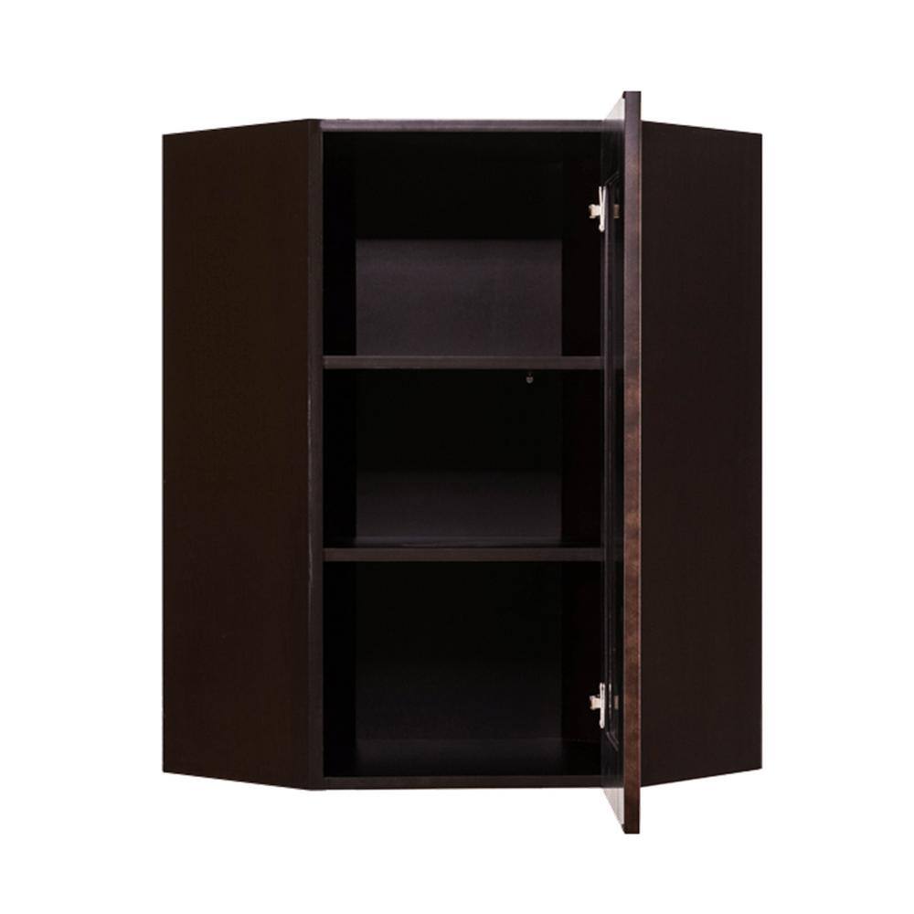 Enhance your kitchen's storage with the Anchester Wall Diagonal Corner Cabinet in Dark Espresso by LIFEART CABINETRY. Crafted from eco-friendly materials, this stylish cabinet features soft-close hinges, adjustable shelves, and a sleek, contemporary finish. Certified with the Kitchen Cabinet Manufacturer Association, it offers both beauty and functionality for any room.