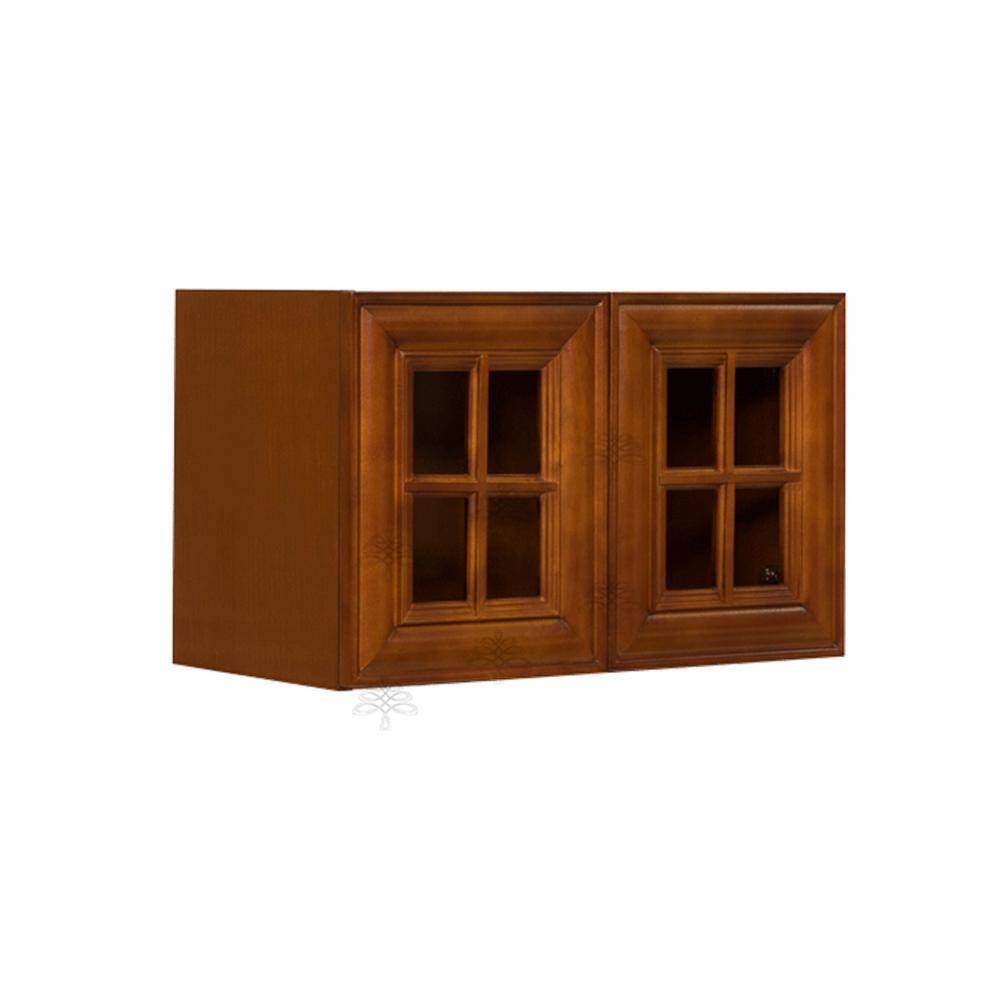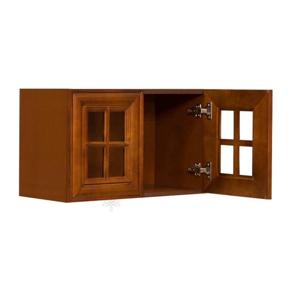 The LIFEART CABINETRY Cambridge Wall Mullion Door Cabinet in chestnut combines elegance with superior functionality. Constructed from solid hardwoods and plywood, it features a stunning stained finish and soft-close doors, offering both aesthetic appeal and durability for any kitchen setting.