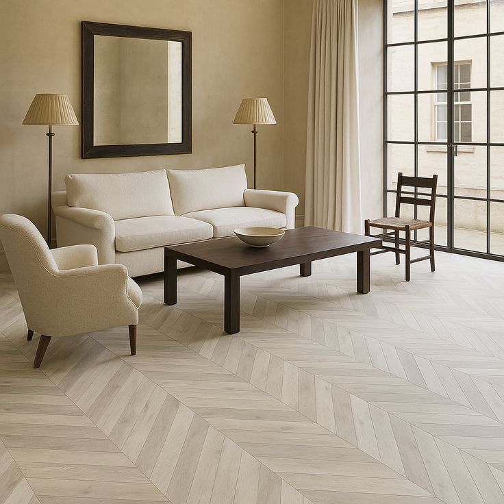 Add a touch of elegance to your home or business with Chevron Chiffon Lace Oak luxury vinyl plank flooring. This 8 mm thick, low gloss flooring boasts an authentic chevron design and a 22 mil wear layer for durability. It is 100% waterproof and can be easily installed in most rooms, including above, on, or below grade surfaces. With its ScratchProtect surface coating, this flooring is resistant to scratches and stains, making it suitable for both residential and commercial use. The pre-attached underlayment provides a warm, comfortable, and quiet surface, and its drop-and-lock installation system makes it easy for anyone to install. It is also treated with Ultra-fresh, which inhibits the growth of mold and mildew. No acclimation is required for installation. Each carton contains 8 planks, covering 18.9 sq. ft., making it a perfect choice for indoor and temperature-controlled environments. Don't wait - buy and install today!
