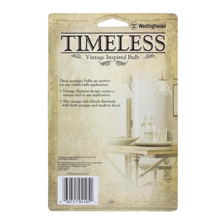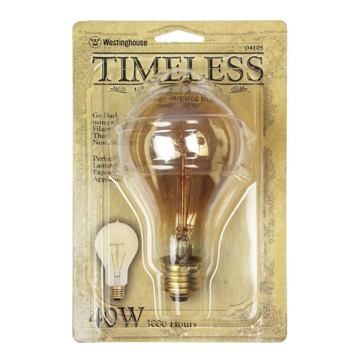 Regular price $12.08The Westinghouse 40-Watt A23 Timeless Vintage Inspired Light Bulb will add a touch of nostalgia to any space. The visible filament design and retro-style silhouette add an Old World feel to any fixture. Timeless light bulbs feature a color temperature of 2450K, meaning the light produced will have a warm, amber glow. A charming nod to the past, the A-Shape vintage style of these bulbs enhances both antique and modern decor in residential or commercial settings. Perfect for use in fixtures where the bulb is visible, from pendants, fans, sconces and table lamps to outdoor porch and post lanterns. With up to 3,000 average rated hours, each bulb offers long-term use, dependability and is completely dimmable. Westinghouse is a trusted, global brand. Westinghouse knows lighting and offers products with exceptional quality, reliability and functionality. Product reference number 04105.