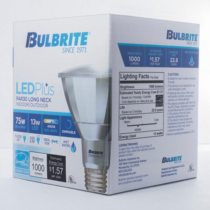 Bulbrite's Dimmable LED PLUS PAR series of outdoor rated PAR20, PAR30 and PAR38 bulbs provides quality lighting for a variety of indoor and outdoor applications. Fully dimmable, these bulbs can be used in recessed lighting in the home and also outdoors for security lighting and porch lighting. It is also UL Listed and ENERGY STAR listed.