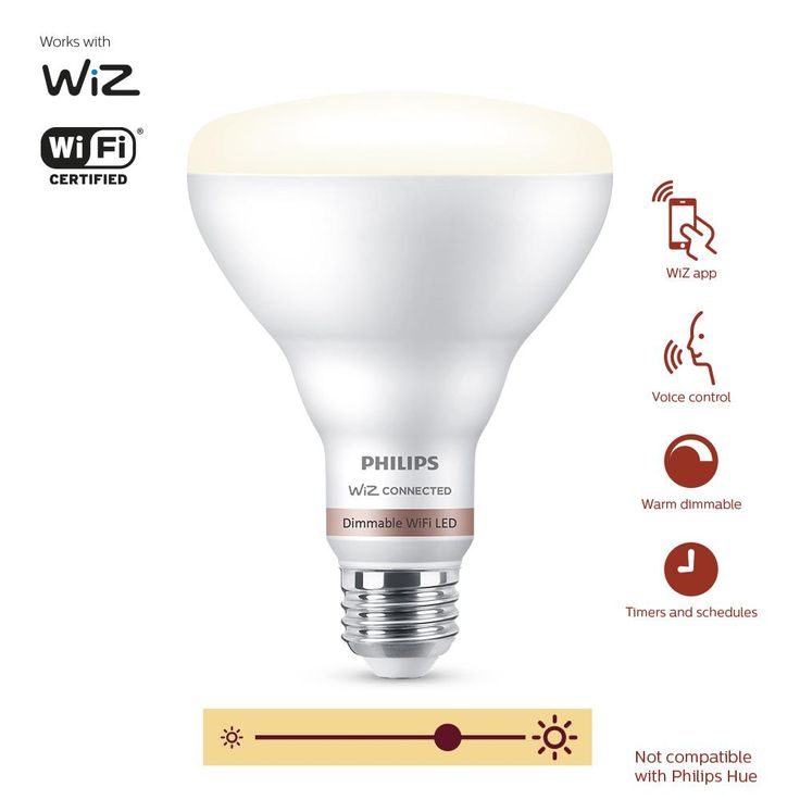 Philips Smart Wi-Fi LED lighting puts you in complete control of your lighting with smart bulbs that are easy to use, functional, and affordable. We’ve made all your favorite high-quality Philips bulbs smarter, just connect them to your existing Wi-Fi network. Smart Dimming Soft White – create a cozy atmosphere with a warm relaxing soft white color. Control your lights wherever you are using the WiZ app or your favorite compatible voice control device. Product requires a Wi-Fi connection to operate wirelessly. Compatible with WiZ apps and products along with Google Assistant, Amazon Alexa, and Siri Shortcuts.