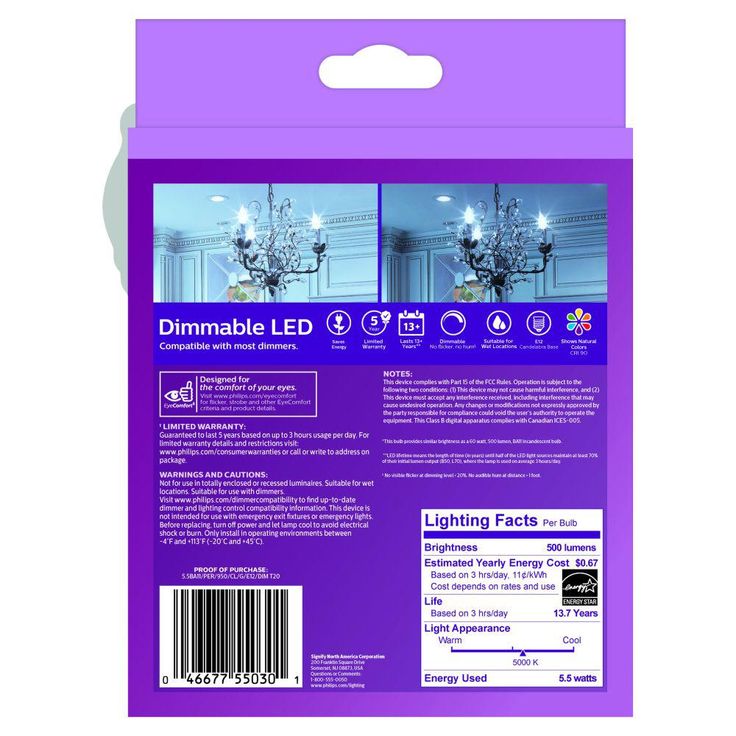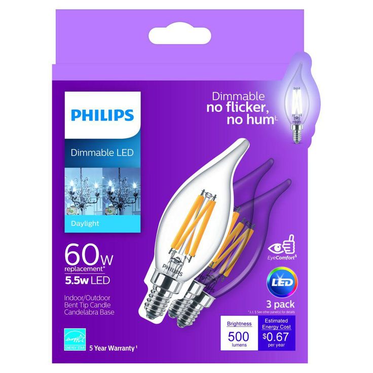 The look you love with the performance you expect. Philips 60-Watt equivalent Dimmable Clear Glass LED B11 light bulbs are a smart energy saving alternative to your standard incandescent with a classic glass design. This Philips 5.5-Watt LED B11 candle Light Bulb in natural daylight is the perfect replacement for anywhere traditional candle shaped bulbs with candelabra base are used, such as chandeliers, foyers, recessed coves and bedrooms. The classic glass design with exposed filament offers a nostalgic, warm appearance.