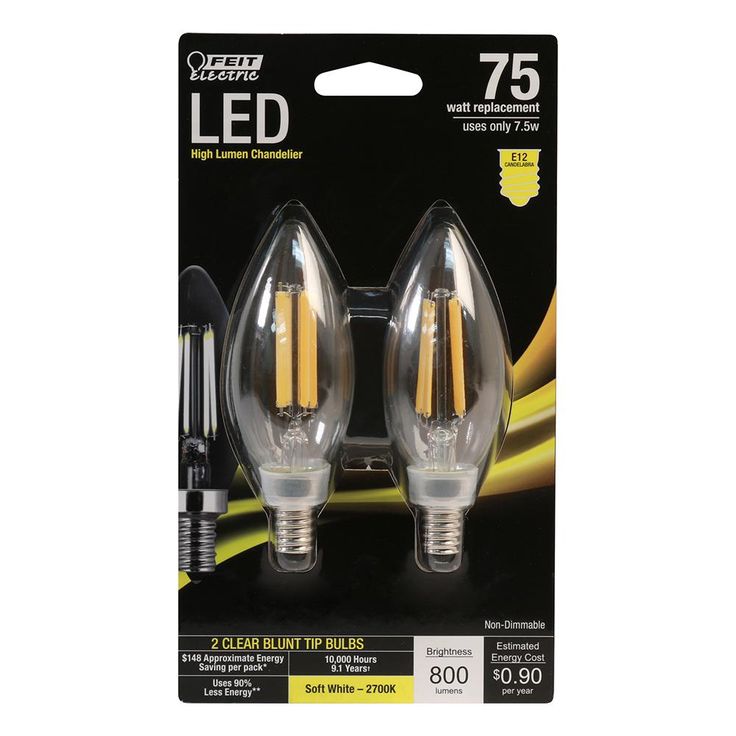 Combine the traditional look and feel of chandelier lighting with the advantages of modern LED technology with the Feit Electric BPCTC75/827/LED/2/6 decorative chandelier LED light bulb 2-pack. This non-dimmable 2700K Soft White light produces 800 Lumens using just 7.5-Watt - saving up to 90% in energy costs over an equivalent 75-Watt incandescent bulb. A stylish tapered look with an exposed filament is ideal for decorative lighting fixtures and will enhance the decor of any room.