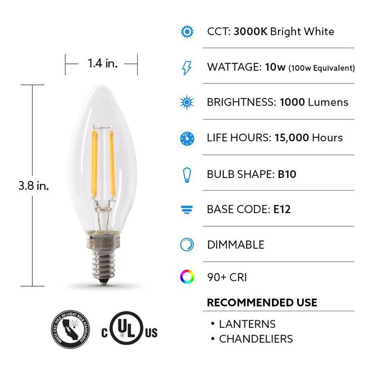 Feit Electric 100-Watt Equivalent B10 Candelabra Dimmable Filament Clear Glass Chandelier LED Light Bulb, Daylight (12-Pack)