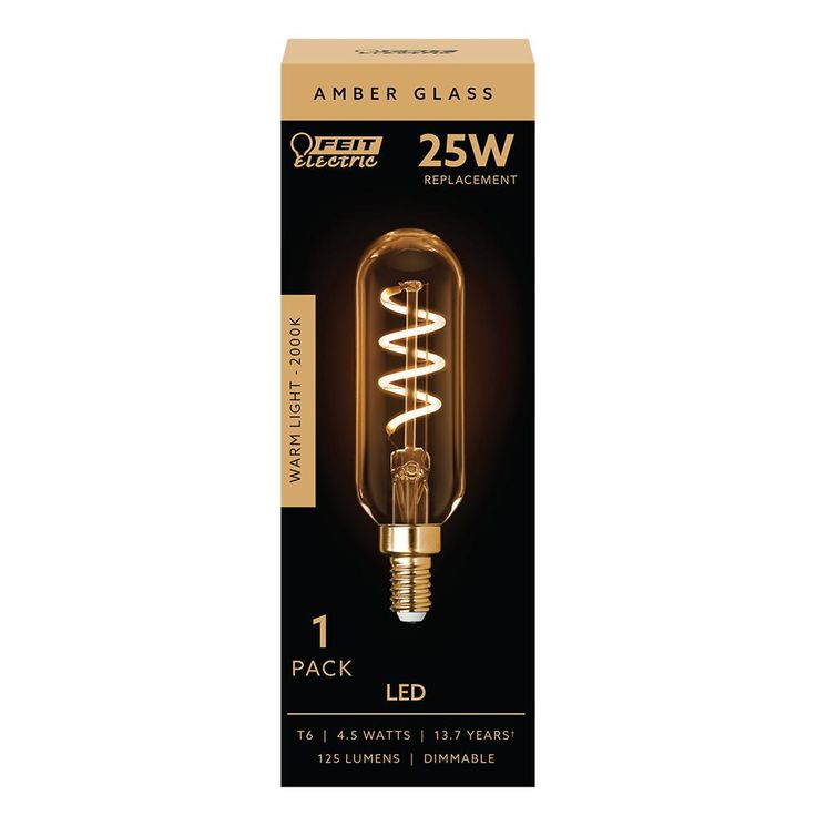 Combine classic style, modern reliability and energy savings with Feit Electric T6 LED 25-Watt Equivalent Warm White (2100K) Spiral Filament Light Bulb. Our vintage filament bulbs are made with LED exposed filament and wrapped in an amber housing to deliver an elegant antique look and feel. We integrate innovative LED technology with a unique spiral filament, providing a natural lighting experience for those that want the benefits of LED's and the look of a vintage lighting. Filament LED's will last for years and use just a fraction of the energy of an incandescent.