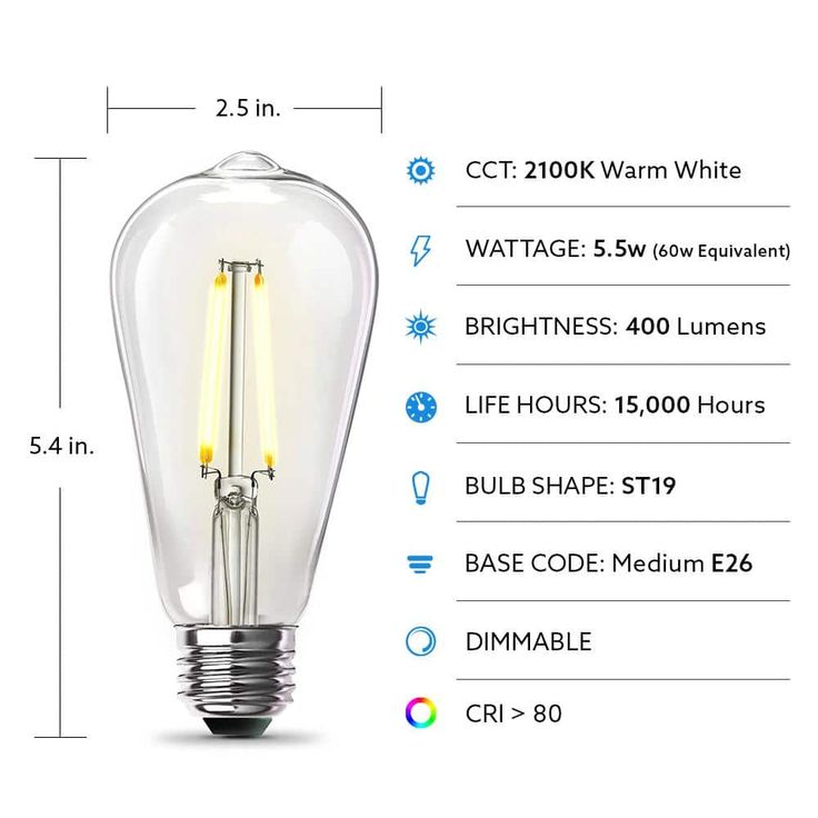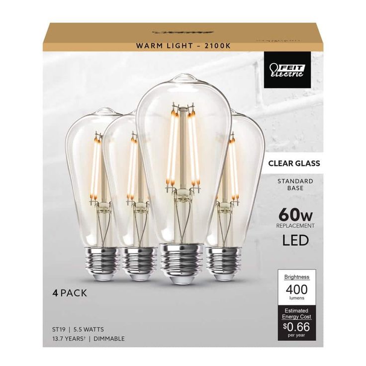 Combine classic style, modern reliability and energy savings with Feit Electric ST19 LED 60-Watt Equivalent Warm White (2100K) 4-Straight Filament Light Bulb. Our vintage filament bulbs are made with LED exposed filament and wrapped in a clear housing to deliver an elegant antique look and feel. We integrate innovative LED technology with a traditional straight filament, providing a natural lighting experience for those that want the benefits of LED's and the look of a vintage lighting. Filament LED's will last for years and use just a fraction of the energy of an incandescent.
