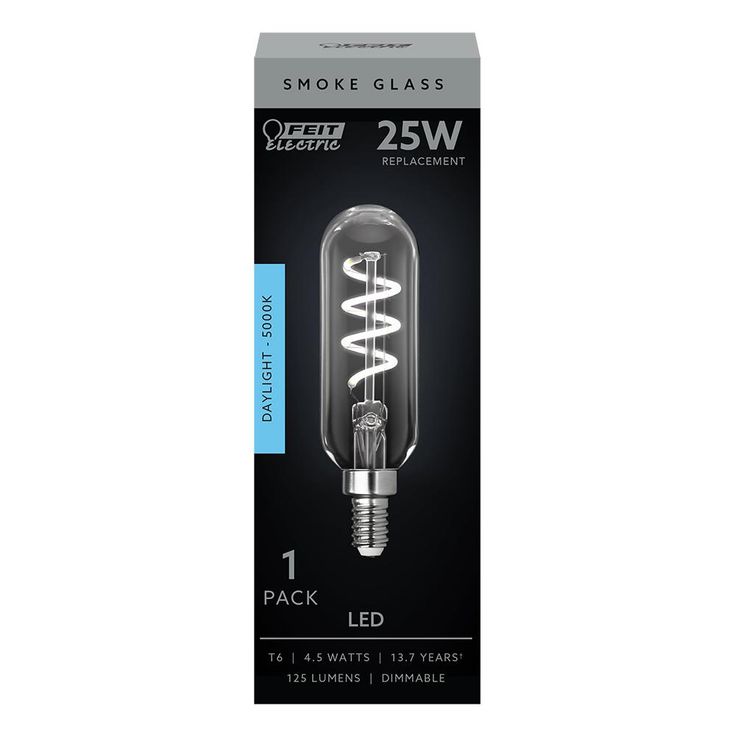 Regular price $74.20Combine classic style, modern reliability and energy savings with Feit Electric T6 LED 25-Watt Equivalent Daylight (5000K) Spiral Filament Light Bulb. Our vintage filament bulbs are made with LED exposed filament and wrapped in a smoke housing to deliver an elegant antique look and feel. The cool daylight shines through smoked glass, casting a distinctive platinum glow. We integrate innovative LED technology with a unique spiral filament, providing a natural lighting experience for those that want the benefits of LED's and the look of a vintage lighting. Filament LED's will last for years and use just a fraction of the energy of an incandescent.