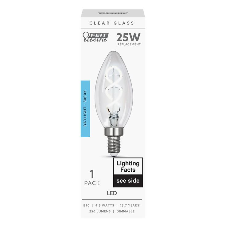 Combine classic style, modern reliability and energy savings with Feit Electric B10 LED 25-Watt Equivalent Daylight (5000K) Spiral Filament Light Bulb. Our vintage filament bulbs are made with LED exposed filament and wrapped in a clear housing to deliver an elegant antique look and feel. We integrate innovative LED technology with a unique spiral filament, providing a natural lighting experience for those that want the benefits of LED's and the look of a vintage lighting. Filament LED's will last for years and use just a fraction of the energy of an incandescent.