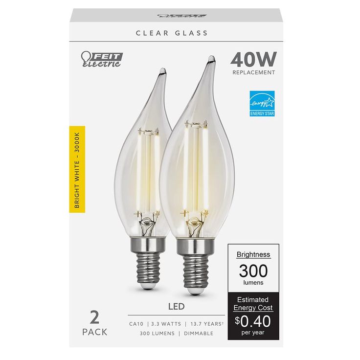 Regular price $116.05Combine classic style, modern reliability and energy savings with Feit Electric CA10 LED 40-Watt Equivalent Bright White (3000K) 2-Straight Filament Light Bulb. Our vintage filament bulbs are made with LED exposed filament and wrapped in a clear housing to deliver an elegant antique look and feel. We integrate innovative LED technology with a traditional filament, providing a natural lighting experience for those that want the benefits of LED's and the look of a vintage lighting. Filament LED's will last for years and use just a fraction of the energy of an incandescent.