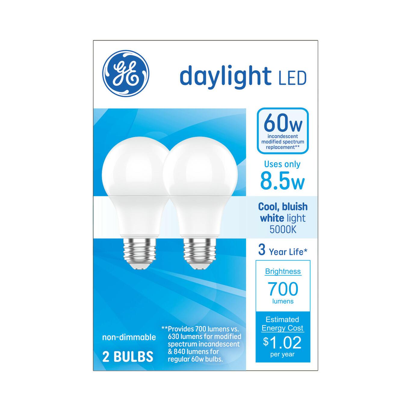 Upgrade everyday lighting with GE Basic A19 LED bulbs that replace 60W incandescents while using only 8.5W. These non-dimmable, 5000K daylight bulbs deliver 700 lumens of bright, cool light with a medium E26 base and an estimated $1.02 yearly energy cost.
