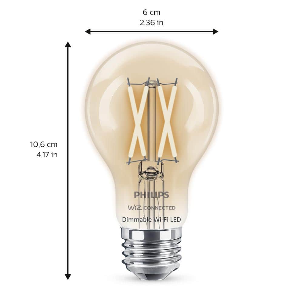 This Philips A19 LED smart bulb delivers warm 2700K soft white light with classic clear filament style, controllable via the WiZ app over 2.4GHz Wi‑Fi. It’s dimmable without a hub, supports voice control with Alexa, Google Assistant, and Siri Shortcuts, and provides efficient 5W operation equal to 40W incandescent.