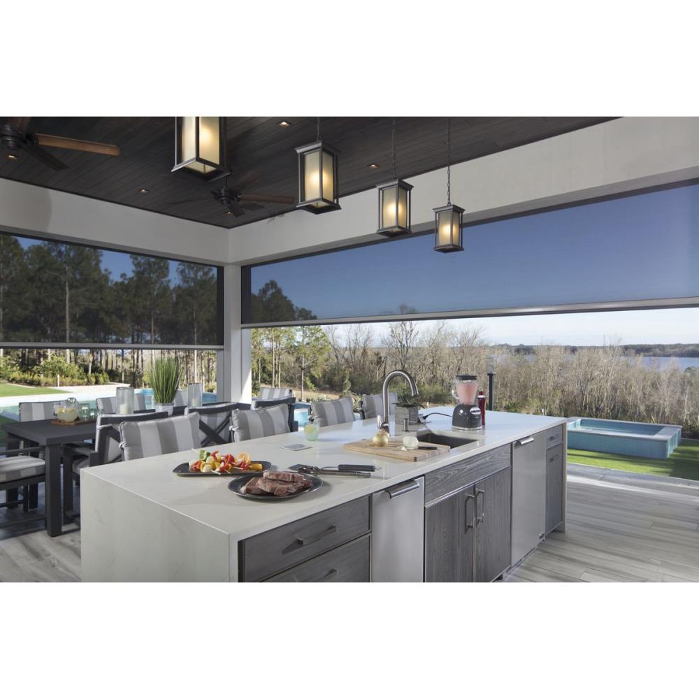 • Transitional Craftsman Design: Antique bronze aluminum frame with elegant etched umber linen glass panels