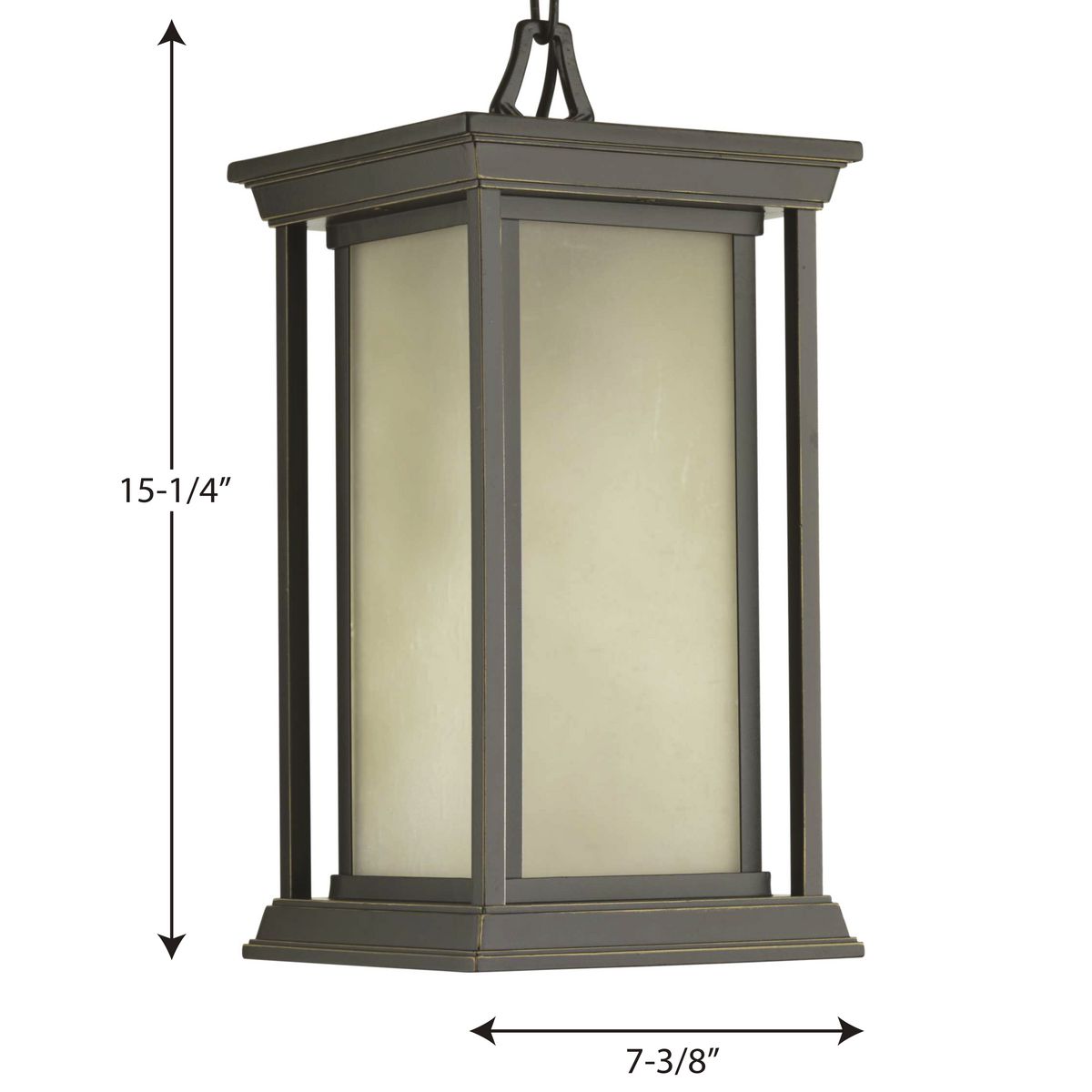 A craftsman-inspired hanging lantern from Progress Lighting’s Endicott collection, featuring an antique bronze aluminum frame and etched umber linen glass. Damp-rated and height-adjustable with a 72-in chain, it uses one E26 bulb up to 100W and is dimmable with compatible bulbs.