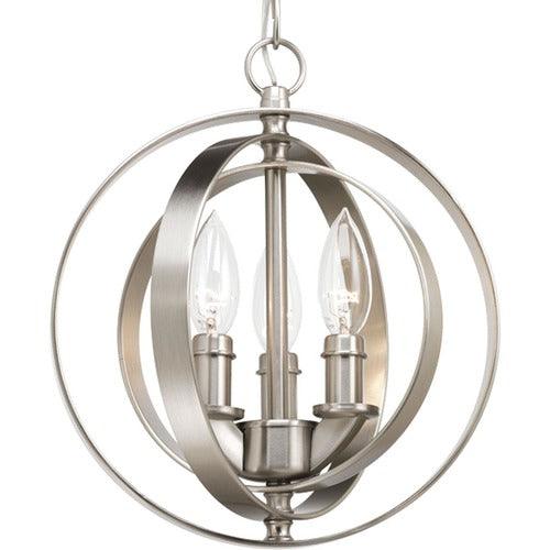 A striking sphere pendant from Progress Lighting’s Equinox collection, featuring pivoting concentric rings around a six-candle candelabra. Designed for indoor spaces, it delivers transitional style in a brushed nickel look with ample illumination and adjustable chain for ideal hanging height.
