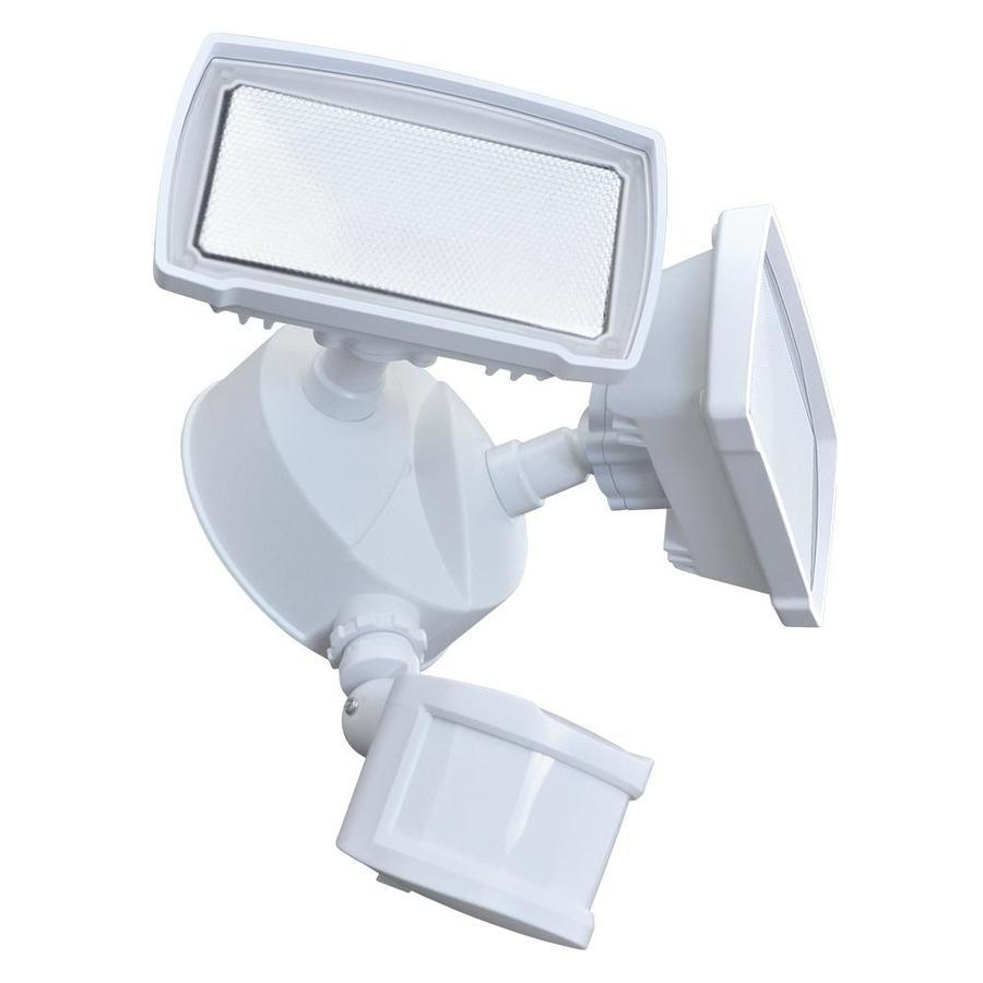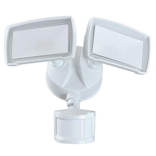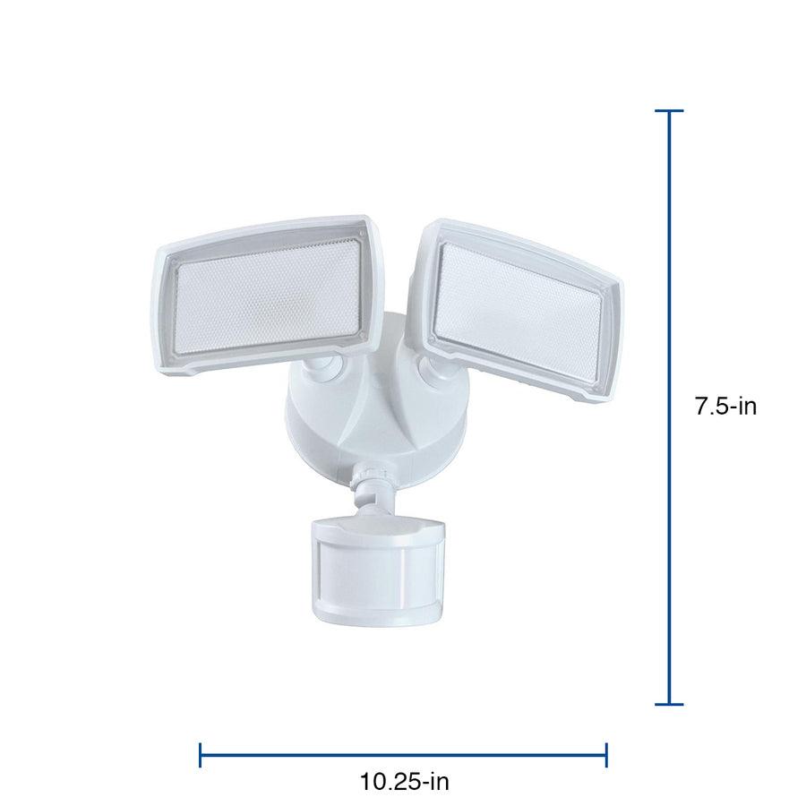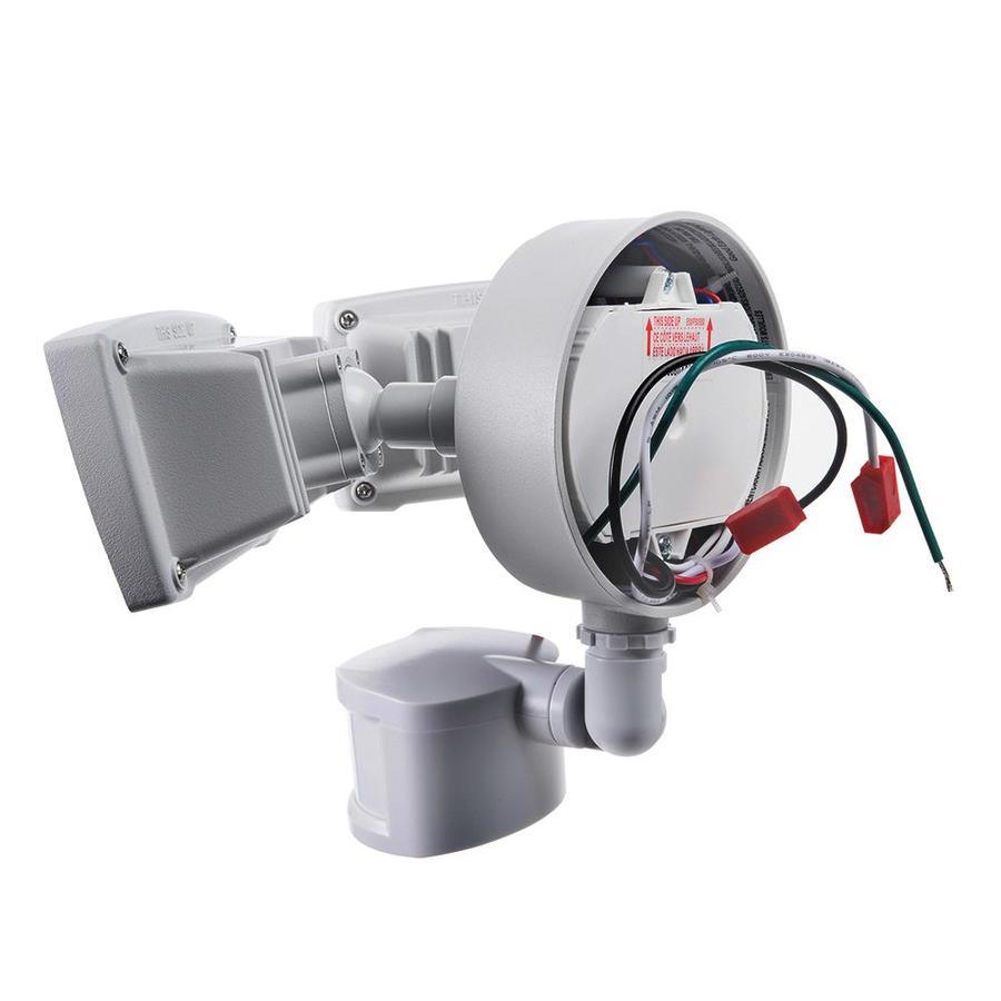 The 2 head LED light has a ball in socket design that allows for easy head rotation; providing precise aiming and broad wide light coverage with a color temperature of 5000K bright daylight 180 ° Adjustable passive infrared sensor (PIR) that detects motion up to 70-ft away Built-in dusk-to-dawn sensor that automatically turns the light on at sunset and off at sunrise for energy savings Time control setting options are available from 1-min, test, 5-min and 10-min to set how long the light will stay on after motion is no longer detected Distance control options are from 10-ft, 20-ft, 50-ft and max which is 70-ft Maximize energy savings and brightness with integrated LEDs that produce 2,138 lumens of light at a low energy consumption of 24-W; Energy Star certified Cold weather rated with a minimum cold start temperature of negative 20 °F; Energy Technology Label listed (ETL) to guarantee and strict quality standards with a 8-year limited warranty Sturdy die cast aluminum construction and shatter-resistant lens with ball in socket design for easy head rotation so light can be directed where it is needed most Universal mounting platform allows for maximum flexibility in installation and is designed to meet requirements for wall, eave or surface box mounting; includes pre-attached push-in wire connecters for fast and easy direct wiring