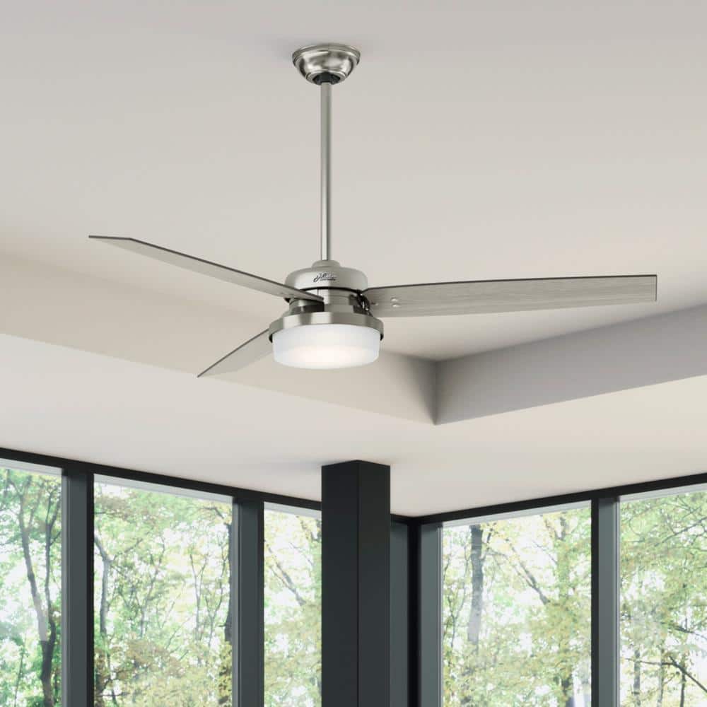 A modern 60-inch ceiling fan designed for large rooms, the Hunter Sentinel pairs a quiet WhisperWind motor with an integrated dimmable LED light. The 3 reversible blades and included handheld remote make it easy to set speed, direction, and lighting for year-round comfort.