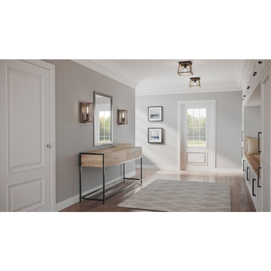 A farmhouse-inspired flush mount featuring an open square frame with aged oak accents and antique bronze plate. Designed for indoor damp locations, it uses one medium-base bulb (up to 60W) and is dimmable for customizable ambiance.