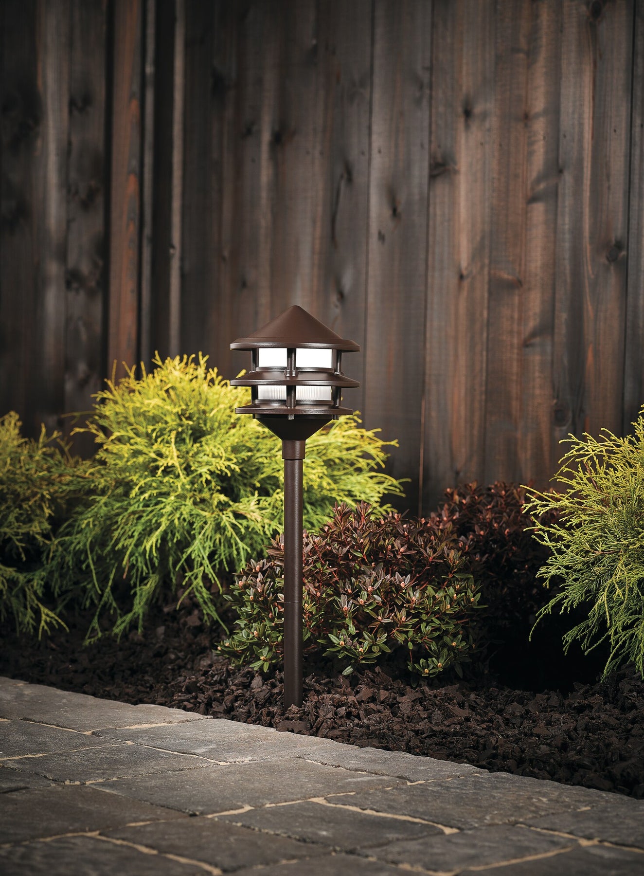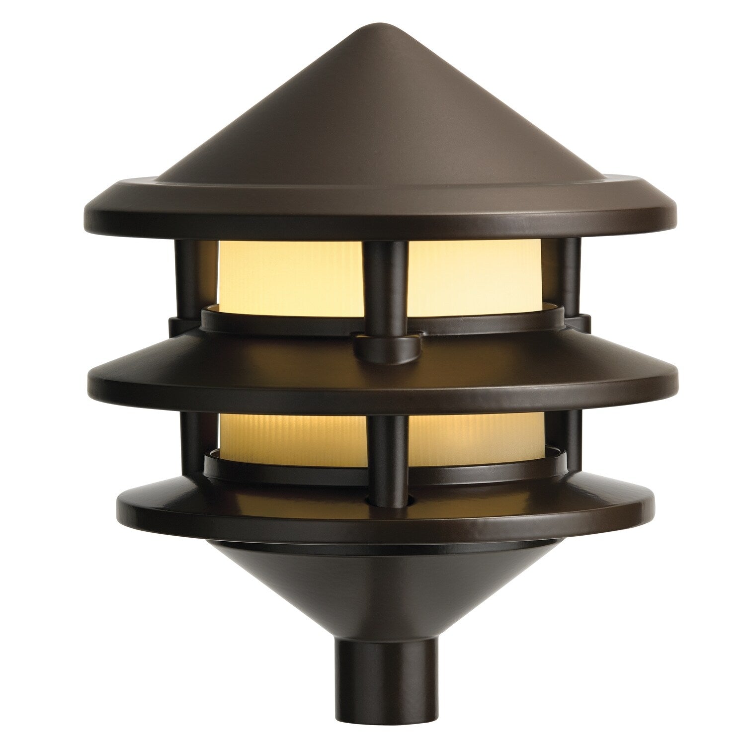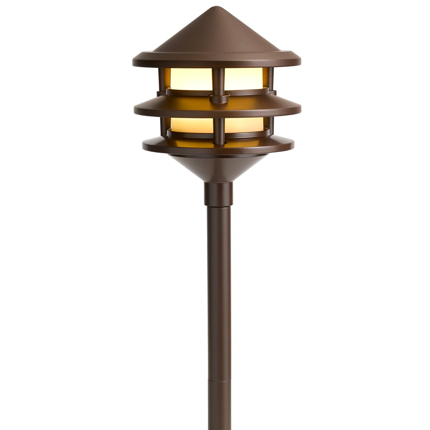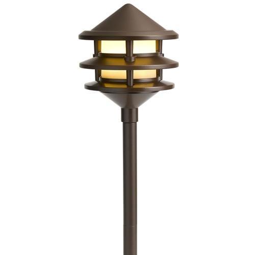 This Olde Bronze path light casts a soft, golden halo that elegantly guides the eye along walkways and plant beds. The tiered, pagoda-inspired silhouette adds sculptural presence by day and atmospheric warmth by night. Style it in rhythmic intervals to frame a stone path or accent lush greenery for a refined outdoor tableau. A sophisticated essential that elevates everyday moments in your landscape.