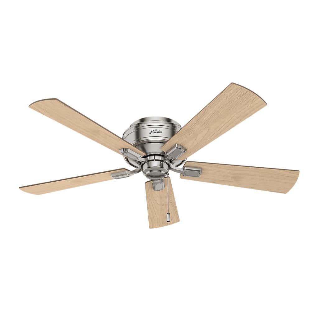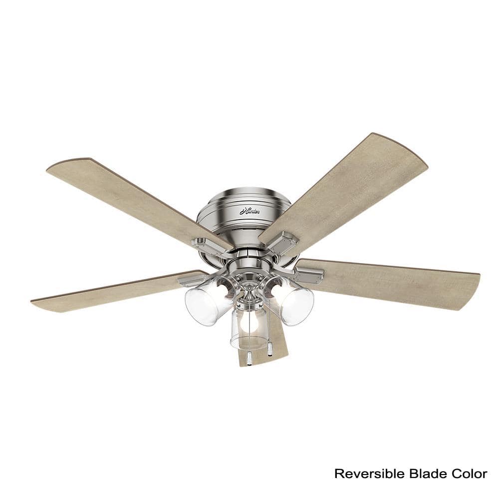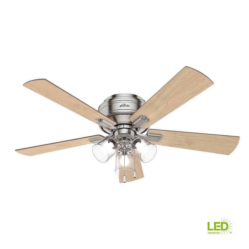 The Hunter Crestfield 52-inch flush mount ceiling fan delivers quiet, powerful airflow for low-ceiling rooms. It features five reversible MDF blades, a WhisperWind AC motor, and a 3-light LED kit with clear glass shades in a brushed nickel finish.