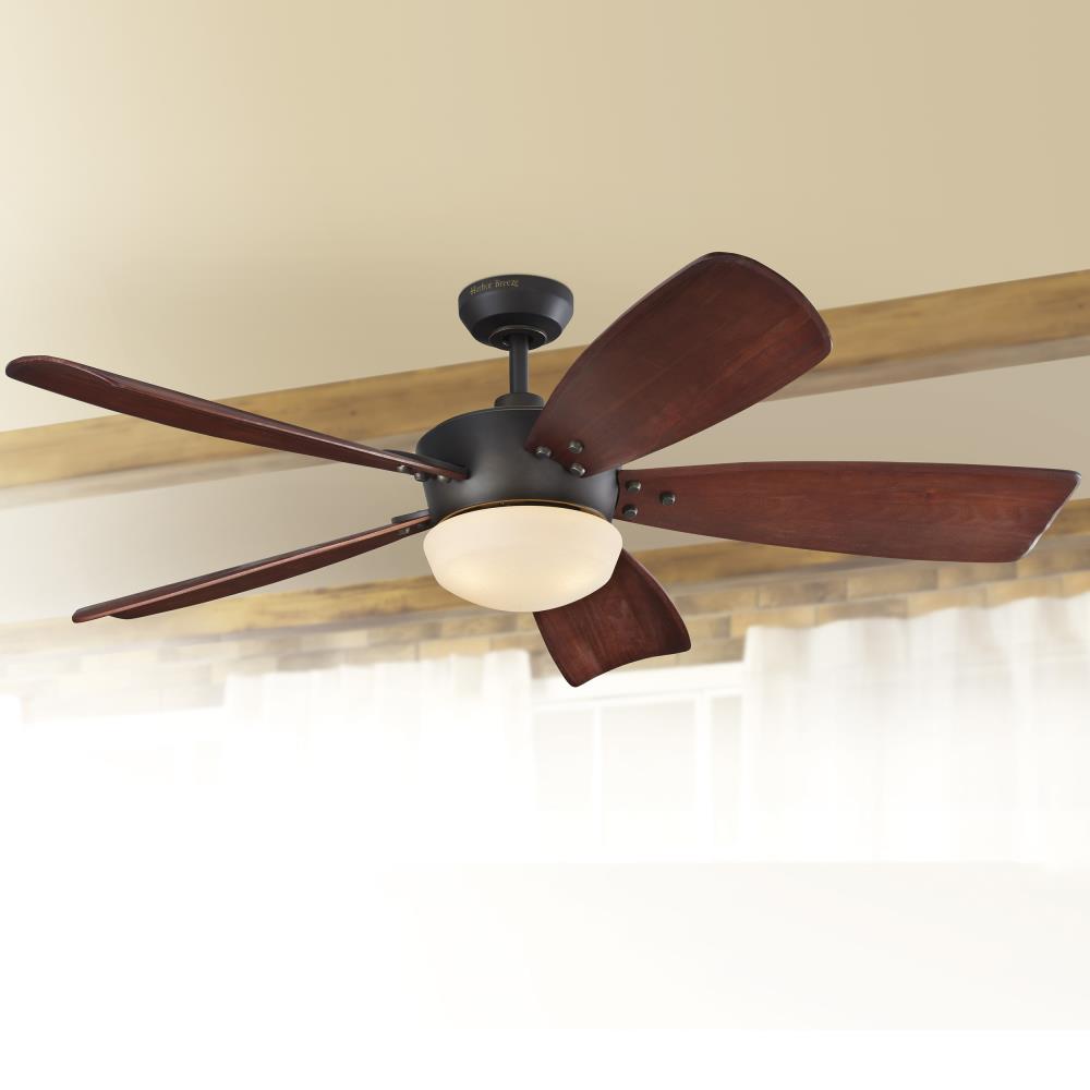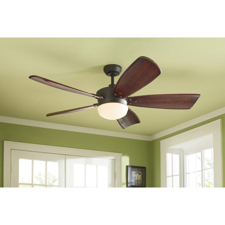 The Harbor Breeze Saratoga brings powerful, quiet airflow to great rooms with a 60-in span and hand-carved auburn wood blades. An integrated light kit with white linen glass uses two dimmable 6.5W LED bulbs for warm, efficient illumination, and the included remote provides convenient 3-speed and light control.