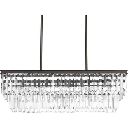 A glamorous linear chandelier from Progress Lighting’s Glimmer collection, featuring cascading prismatic clear glass on an antique bronze steel frame. Adjustable stems and chain accommodate various ceiling heights, making it perfect over kitchen islands or dining tables.