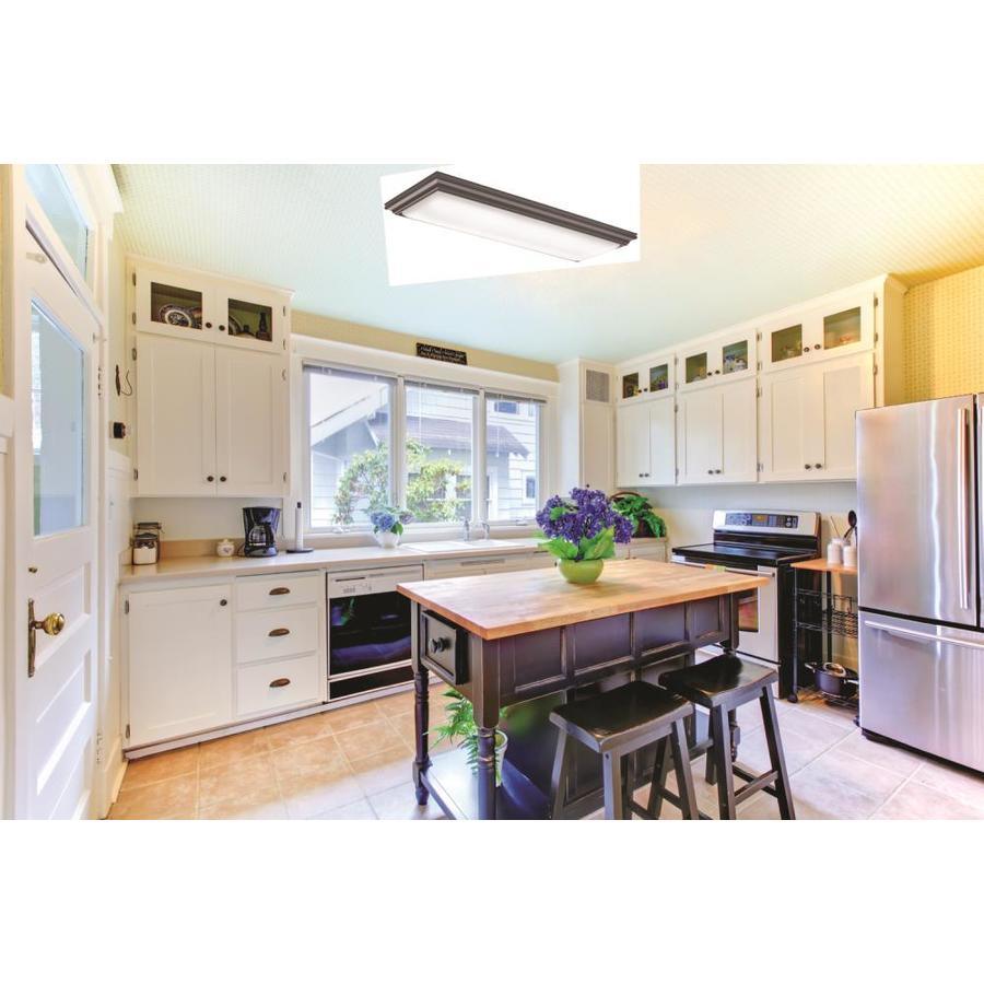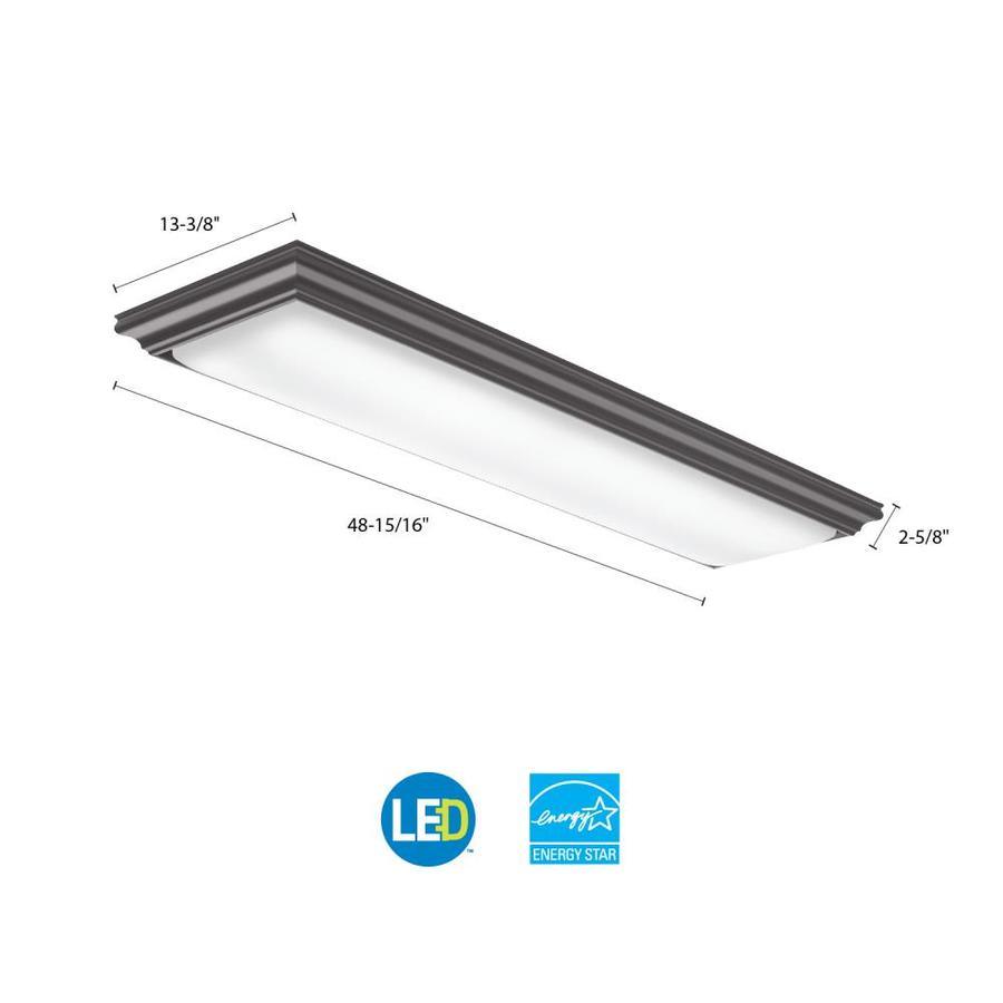 Energy star certified by using minimal watts and providing the lumens needed to light the room Works with most standard incandescent dimmers Energy Star Rated, suitable for damp locations Standard 120 volts used in most residential applications and designed for flush mount installation Long lasting LED technology maintains 70 percent of lumen output for 50,000 hours with 4000 Kelvin color temperature The matte white acrylic diffuser delivers 3,100 lumens while softening the appearance of the LEDs Emergency battery back-up not included in this version Buy with confidence with a 5-year limited warranty Dimensions: width 13 x 47.56 x depth 2.62