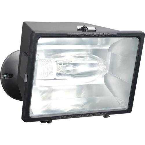 Weather-resistant aluminum housing with a dark-bronze finish Clear glass bulb cover Wall or eave-mount installation Brightly illuminates driveways, lots, yards, docks or landscapes UL Listed Requires one 100 watt metal halide bulb Has a large lens that helps brightly illuminate the surrounding area