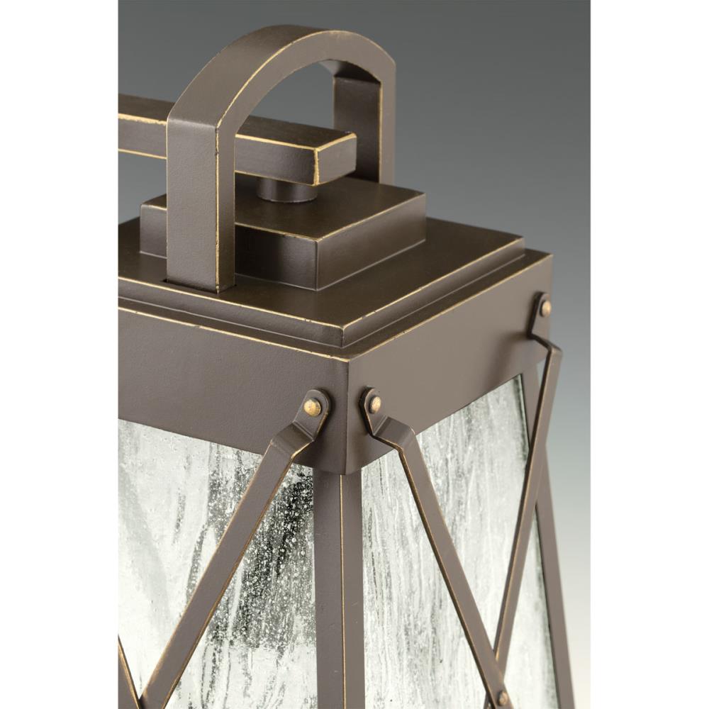 This Creighton lantern pendant by Progress Lighting showcases a rustic, tapered cage in a handsome Antique Bronze finish with elegant clear water glass panels. Designed for covered outdoor spaces or interiors, it uses one medium-base bulb and includes a 72-in adjustable chain for flexible installation. Damp-location listed and dimmable with compatible bulbs, it blends farmhouse charm with durable aluminum construction.