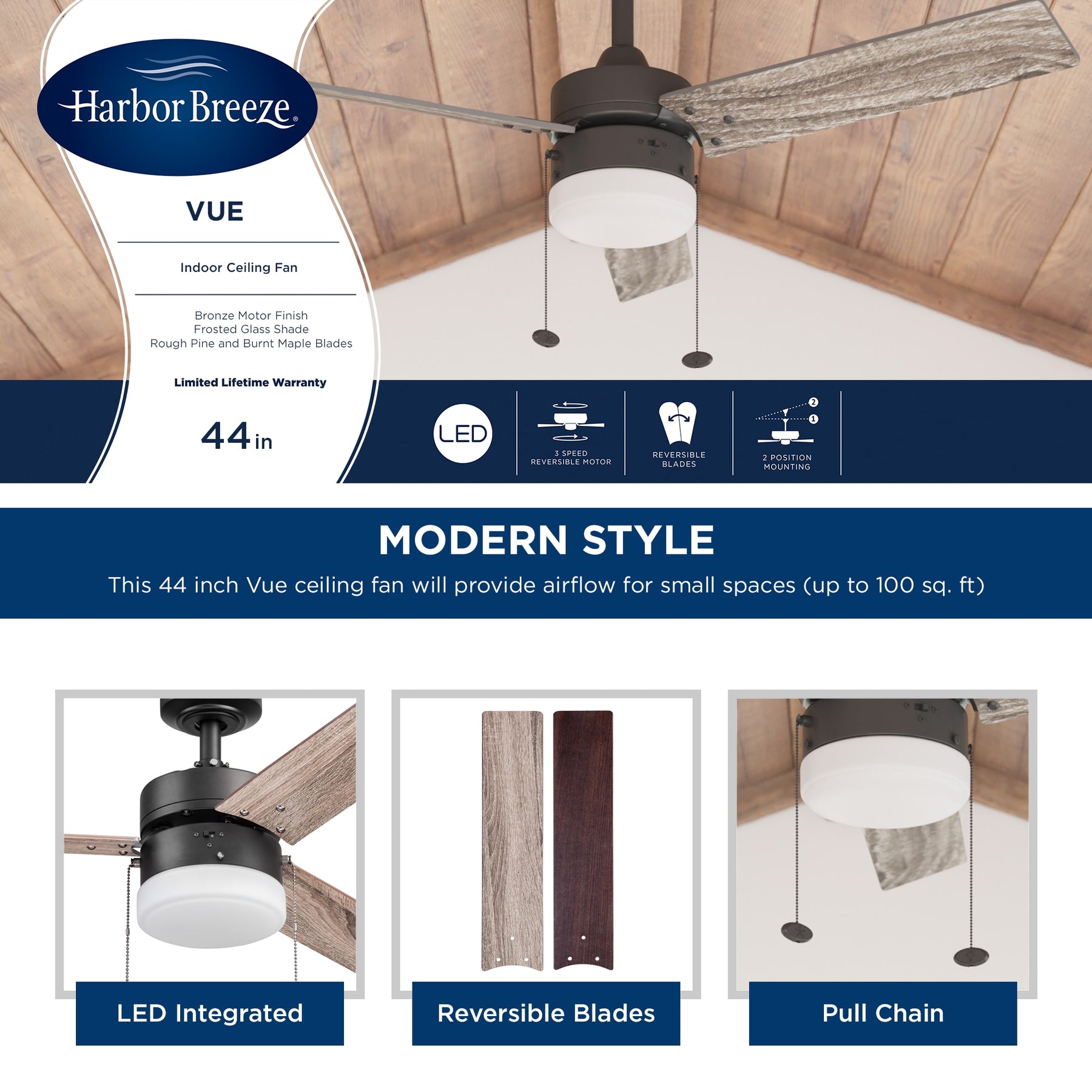 Refresh your space with quiet, efficient airflow and warm LED light—add the Harbor Breeze Vue to your cart today.