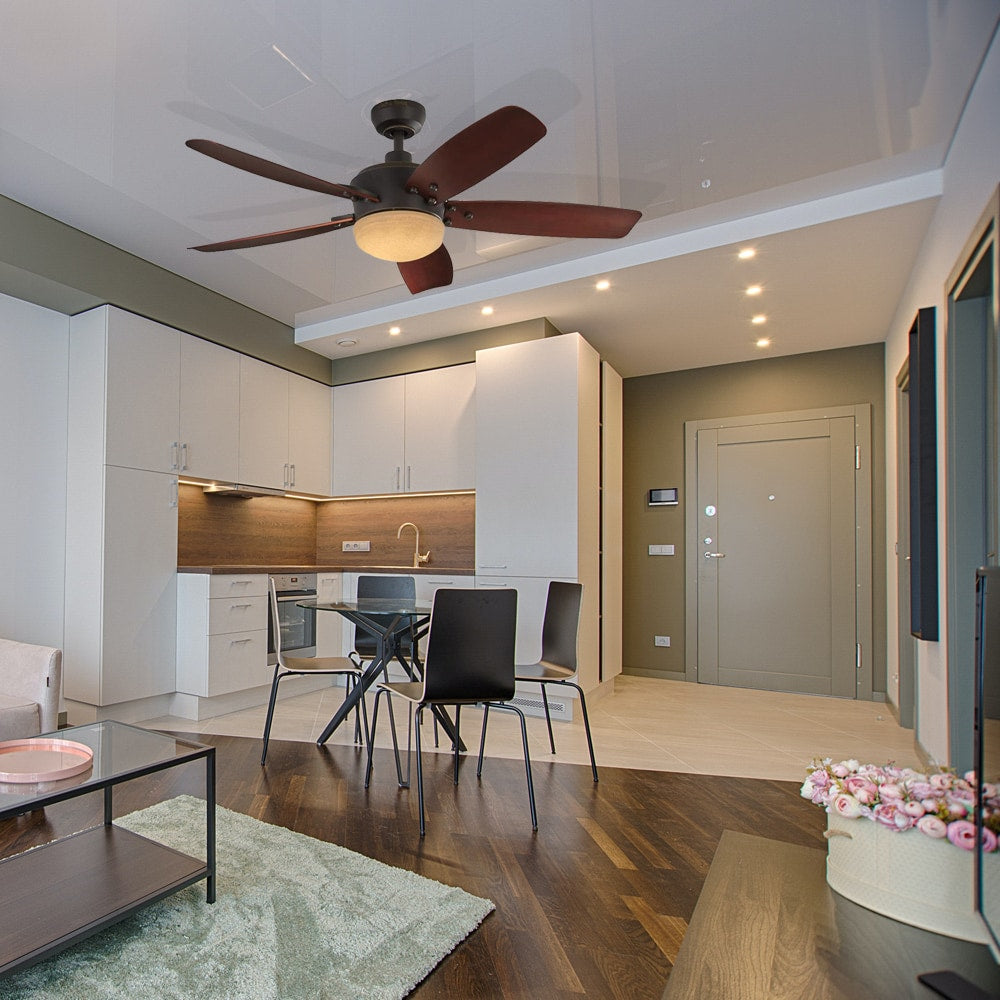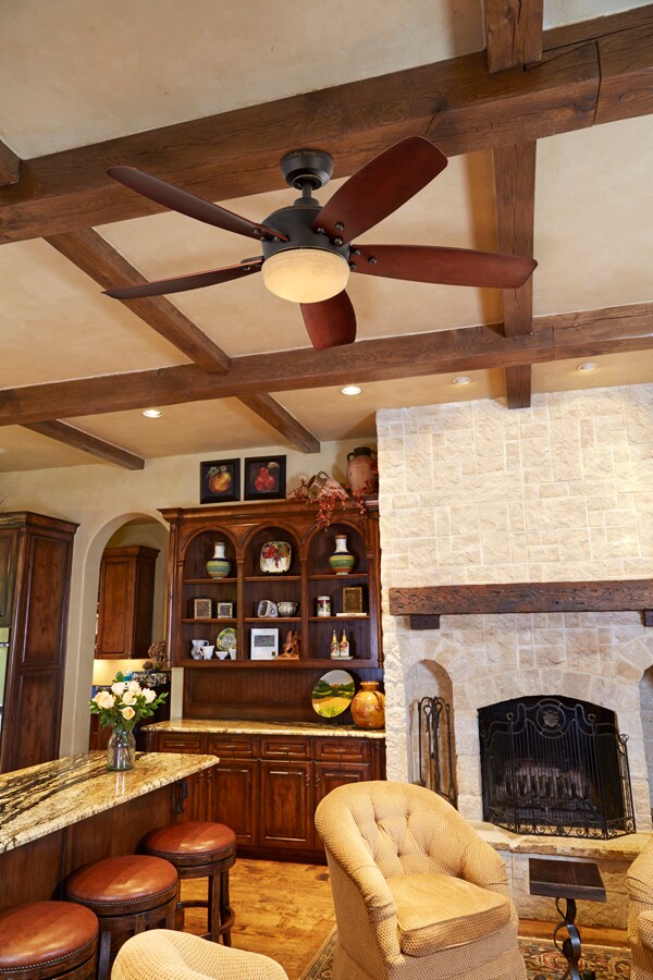Saratoga’s oil‑rubbed bronze silhouette and auburn blades bring a refined warmth that anchors a space with quiet confidence. The linen-glass globe diffuses light like a soft sunset, creating an inviting glow above kitchens or covered patios. Style it with natural textures—woven stools, warm woods, and matte metals—for a layered, collected look. It’s a polished essential that elevates comfort while delivering effortless, everyday luxury.