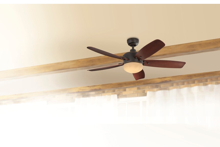 The Harbor Breeze Saratoga 48-inch ceiling fan pairs an oil-rubbed bronze housing with auburn all‑weather ABS blades for reliable performance indoors or in covered outdoor spaces. An integrated 18W dimmable LED behind white linen glass delivers warm 3000K light, while the included remote provides 3-speed control and reverse for year-round comfort.