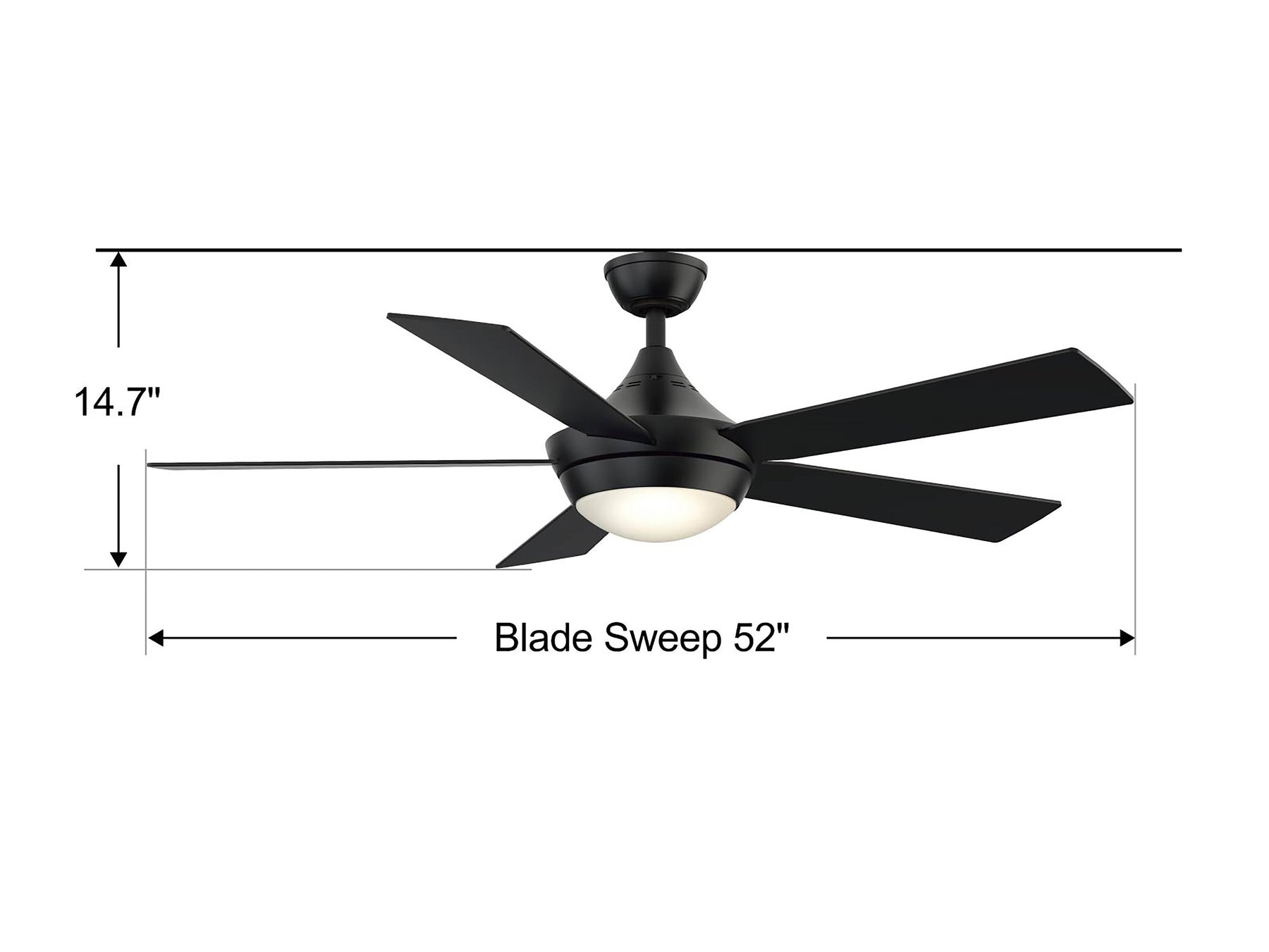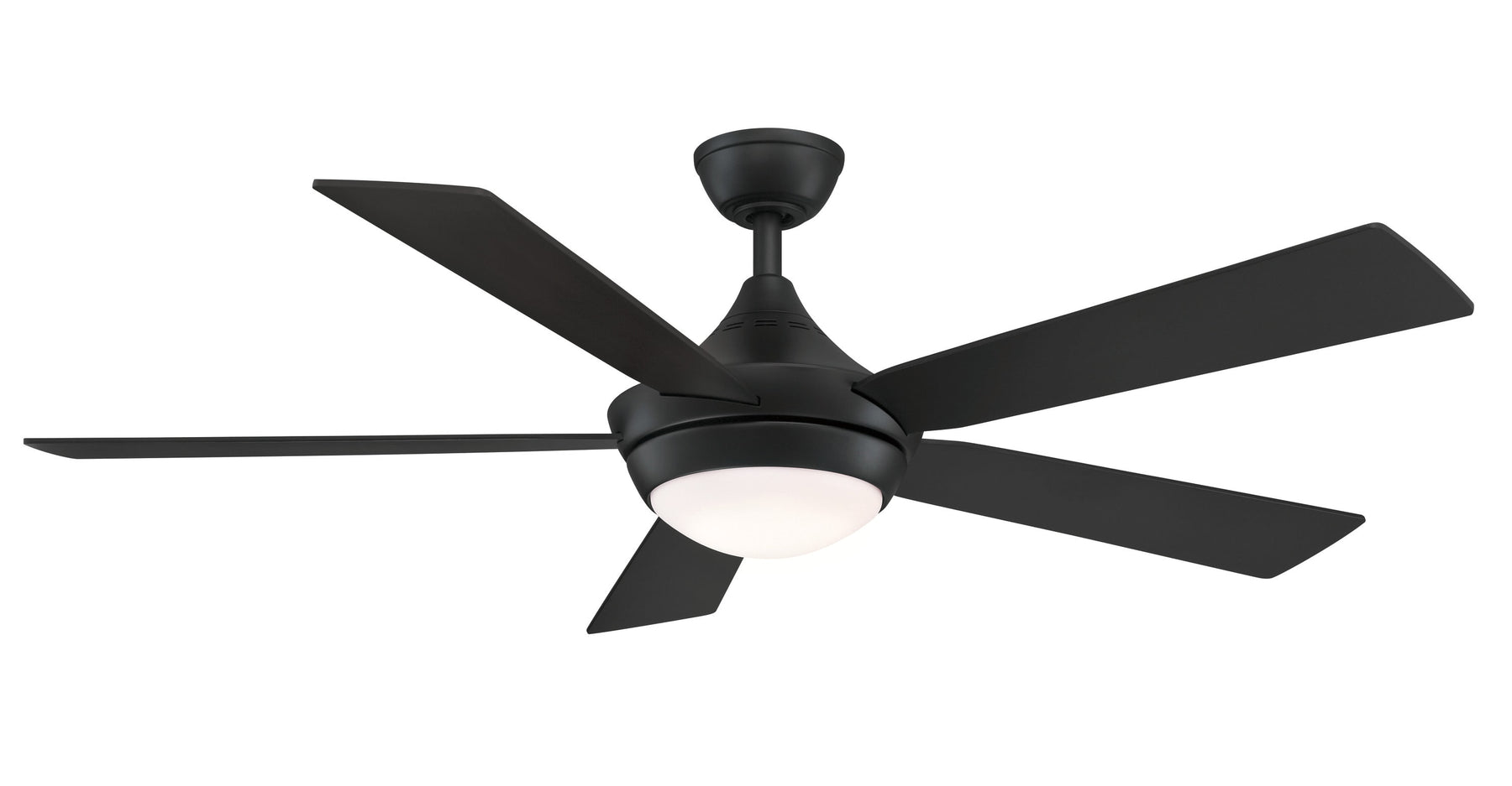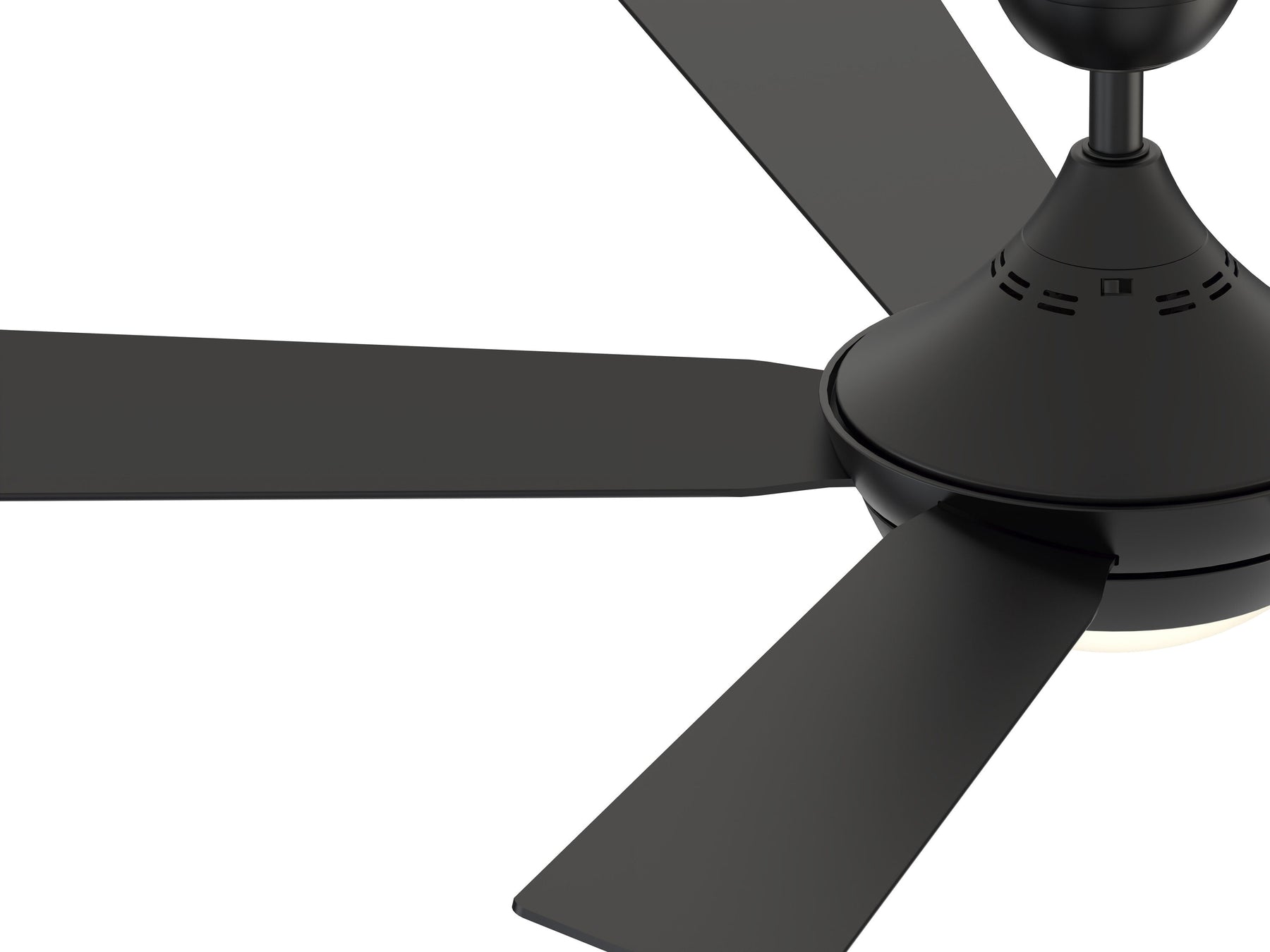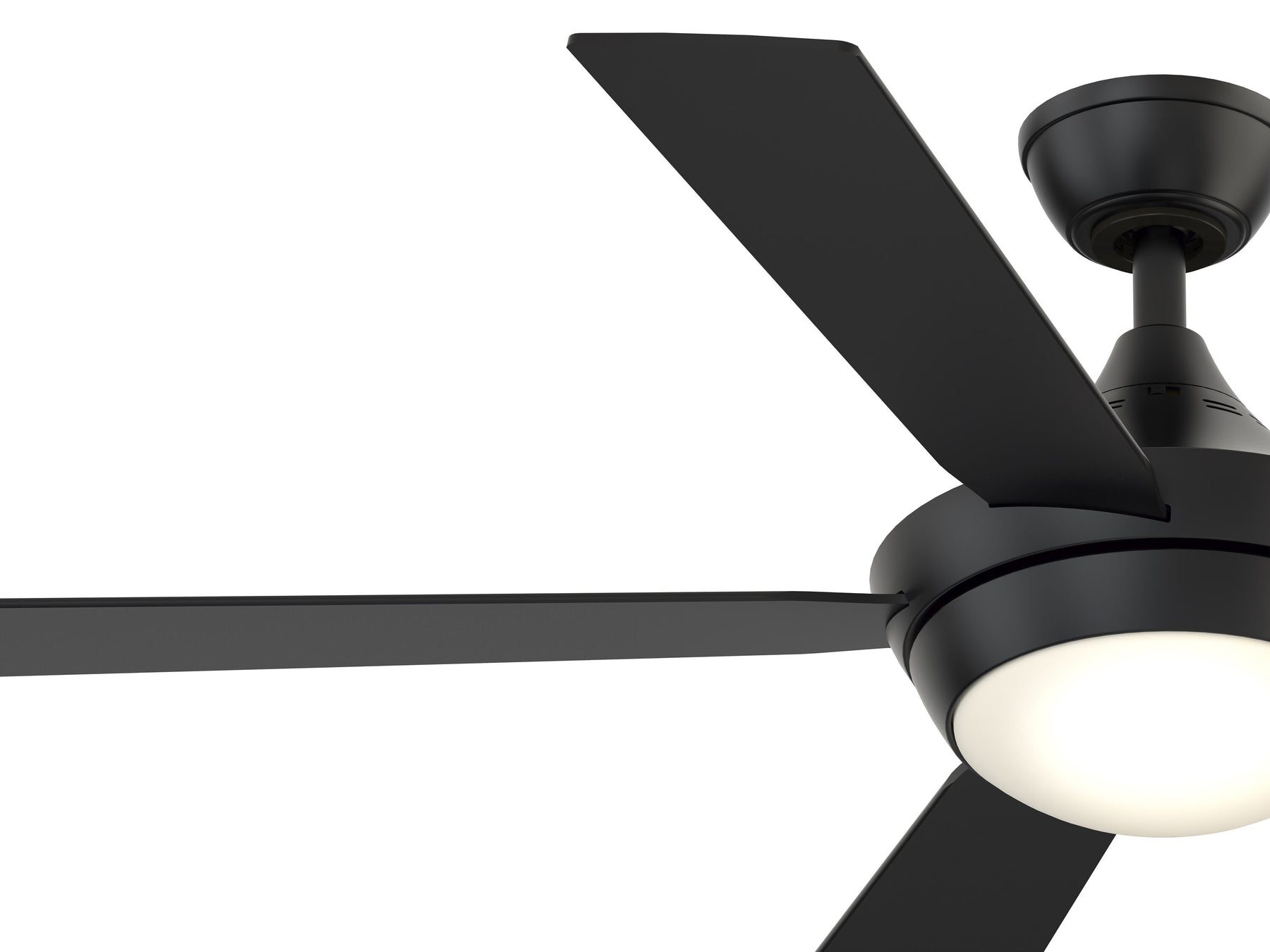 This 52-inch Fanimation Studio Collection AireDrop ceiling fan delivers powerful airflow and smart control in a sleek matte black finish. It features an energy-efficient 3-speed AC motor, integrated 18W dimmable LED light with frosted glass, and built-in fanSync WiFi for app and voice assistant control.