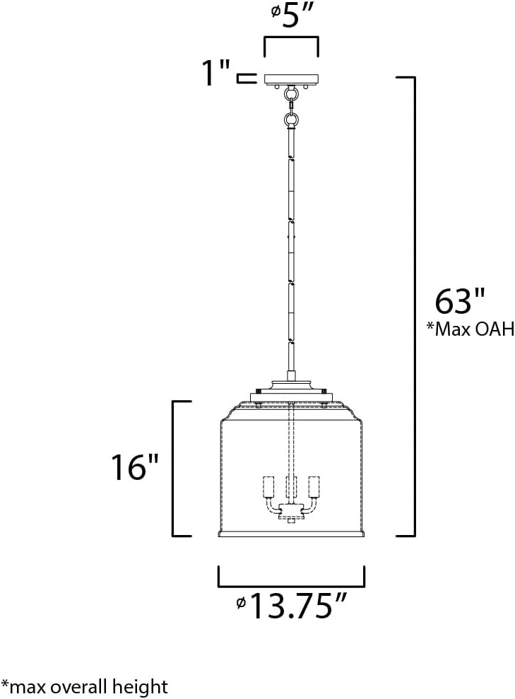 A: The shade/fixture is approximately 13.75 inches in diameter by 16 inches high, with a maximum overall hanging height of 63 inches.