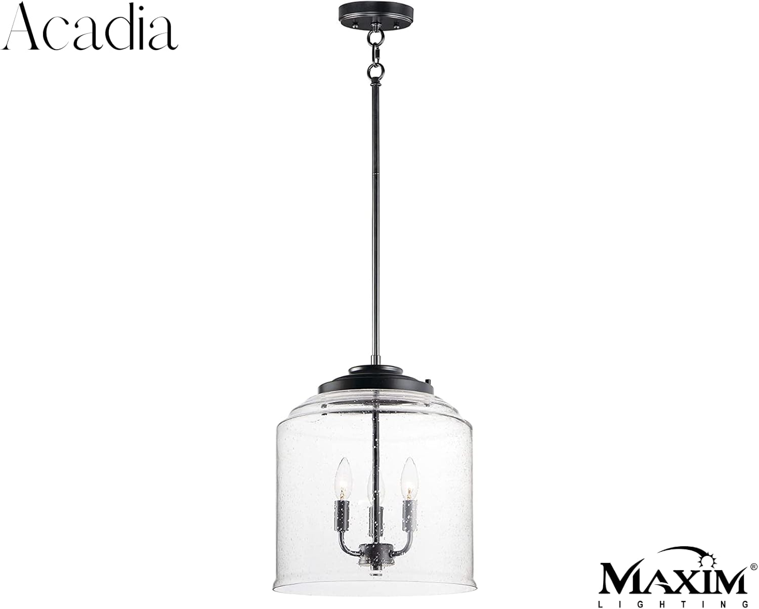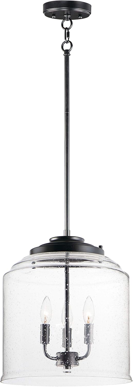 A refined transitional pendant from Maxim Lighting’s Acadia collection, featuring a clear seeded glass bell shade and a sleek black steel frame. The 3-light candelabra design delivers warm, dimmable illumination ideal for kitchens, dining rooms, and entryways.