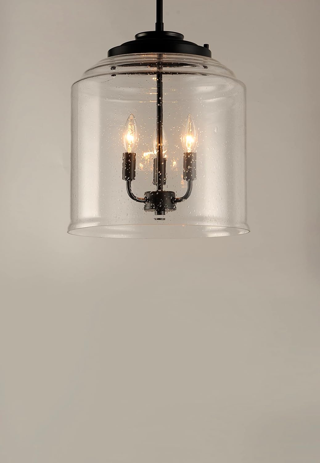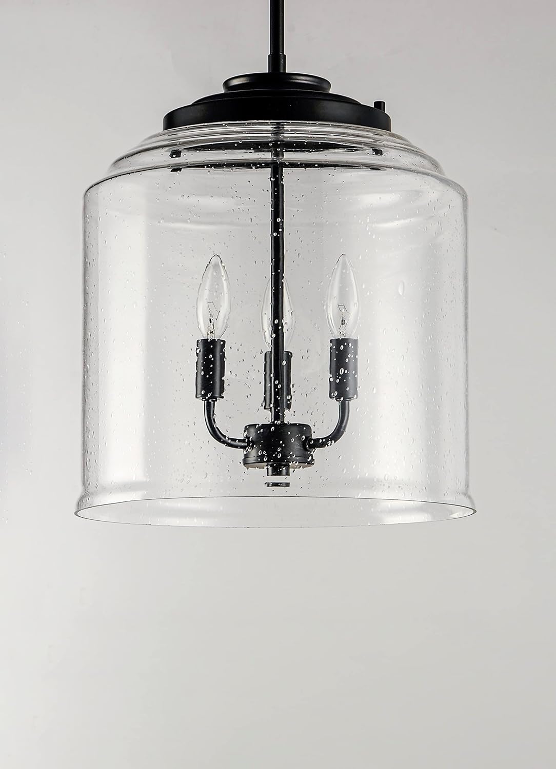 Customers praise the seeded glass and clean, transitional styling that suits kitchens and foyers; many note the fixture looks high-end and provides warm, inviting light. Installation is generally straightforward, and users appreciate the adjustable hanging height. Some mention that sourcing the right candelabra bulbs affects brightness and dimming performance, and a few found the glass shade heavier than expected, requiring careful handling.