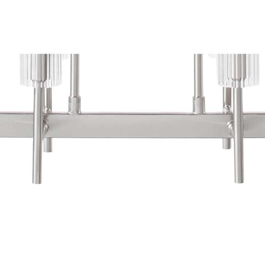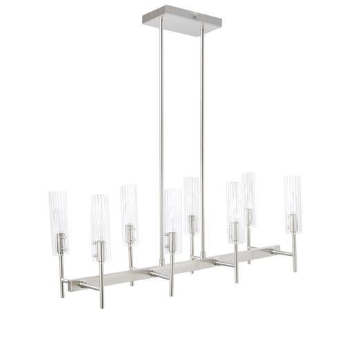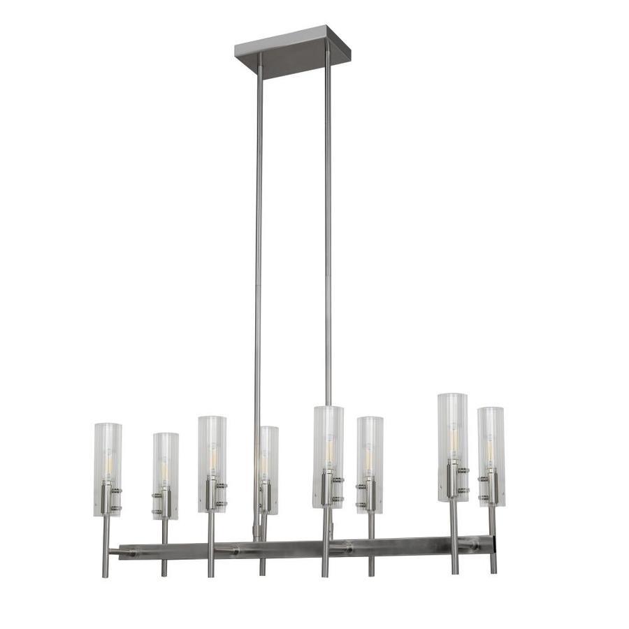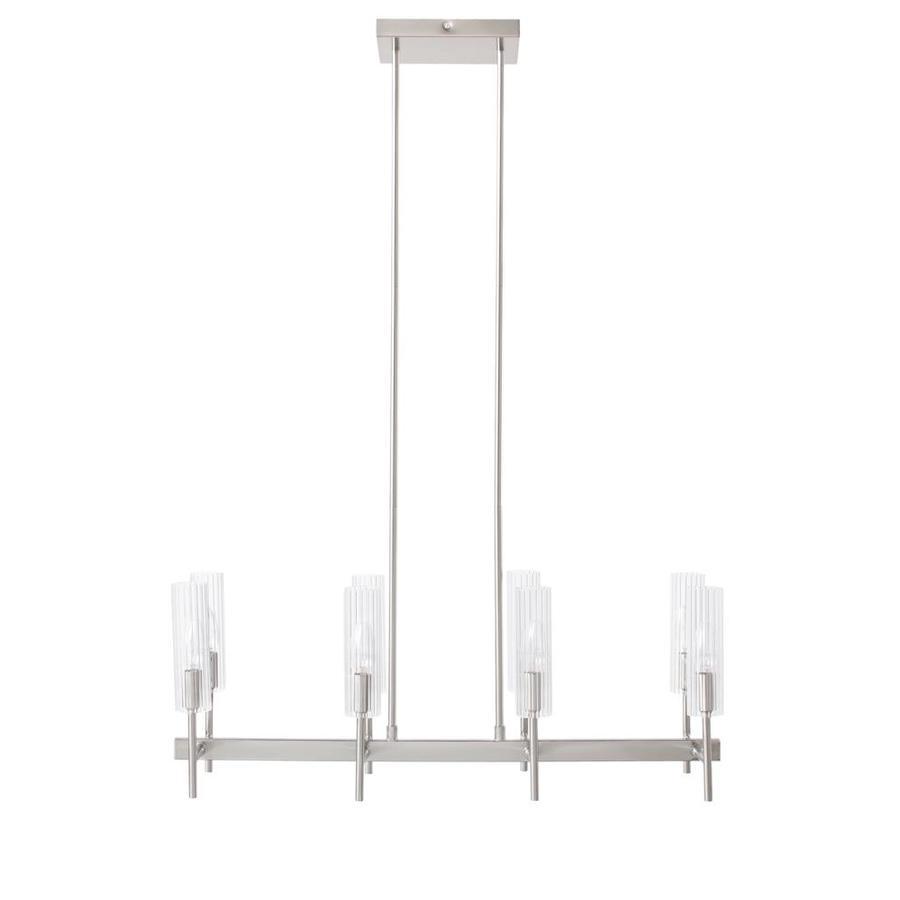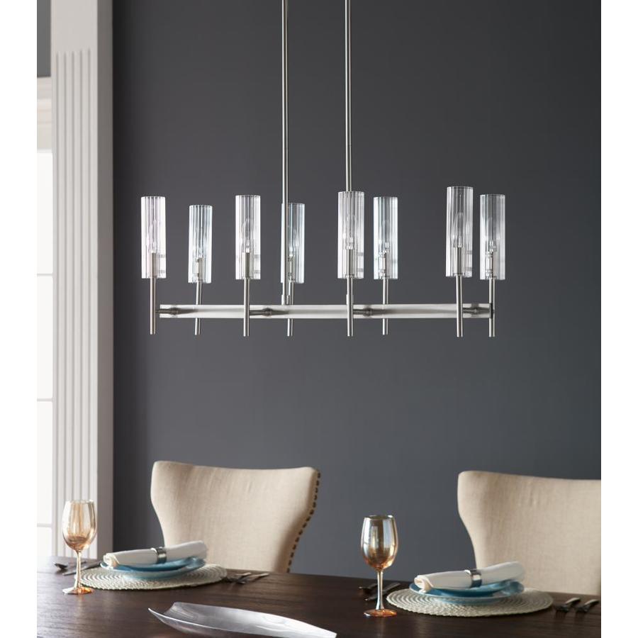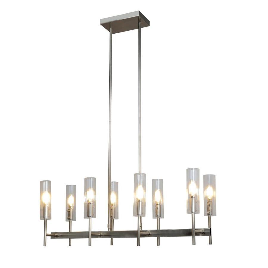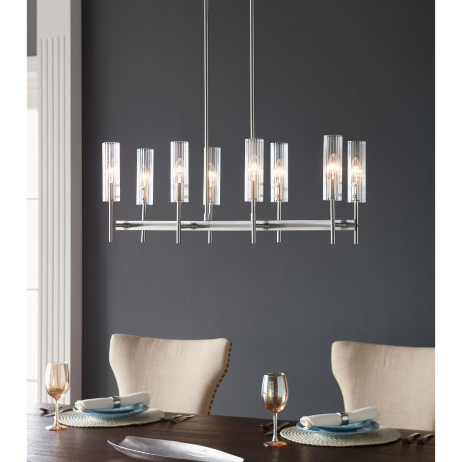 8 Light chandelier in brushed nickel is sleek and sophisticated, perfect for above your kitchen island Clear glass cylinder shades are the perfect showcase for decorative bulbs Recommended use of eight 40 watt candelabra base light bulbs, not included Installed as an uplight only Great for modern style decor Damp rated, safe for use in your kitchen Pair with other items from the Windsor collection for a complete and dramatic look