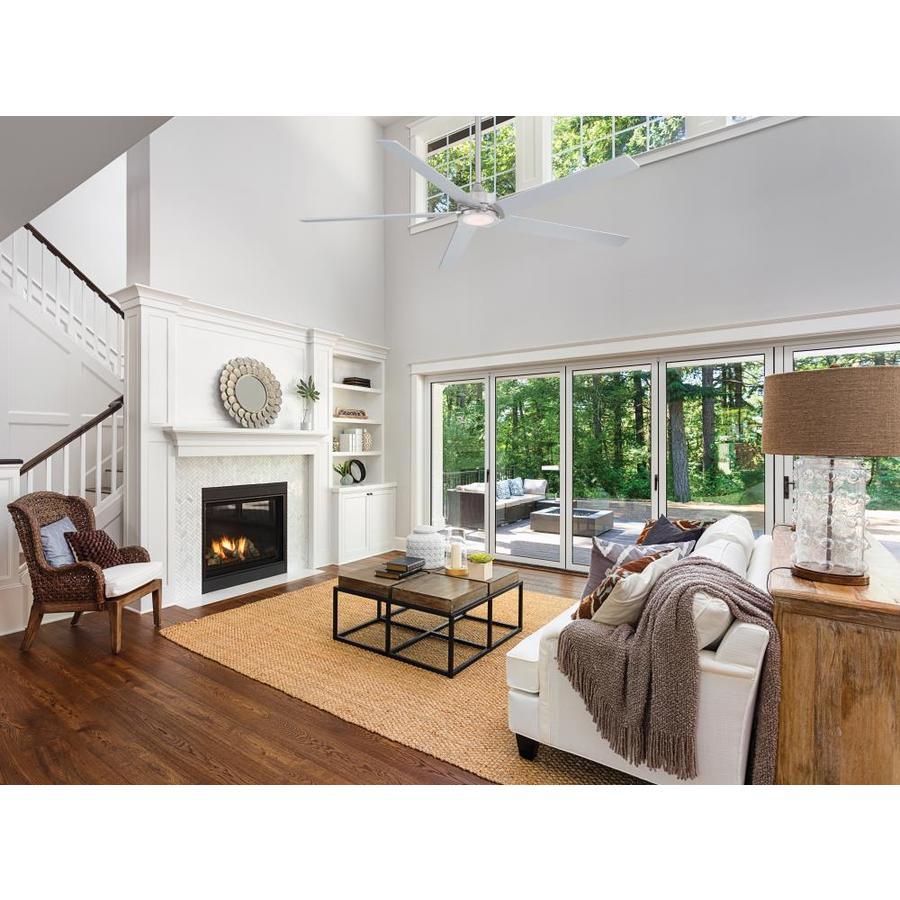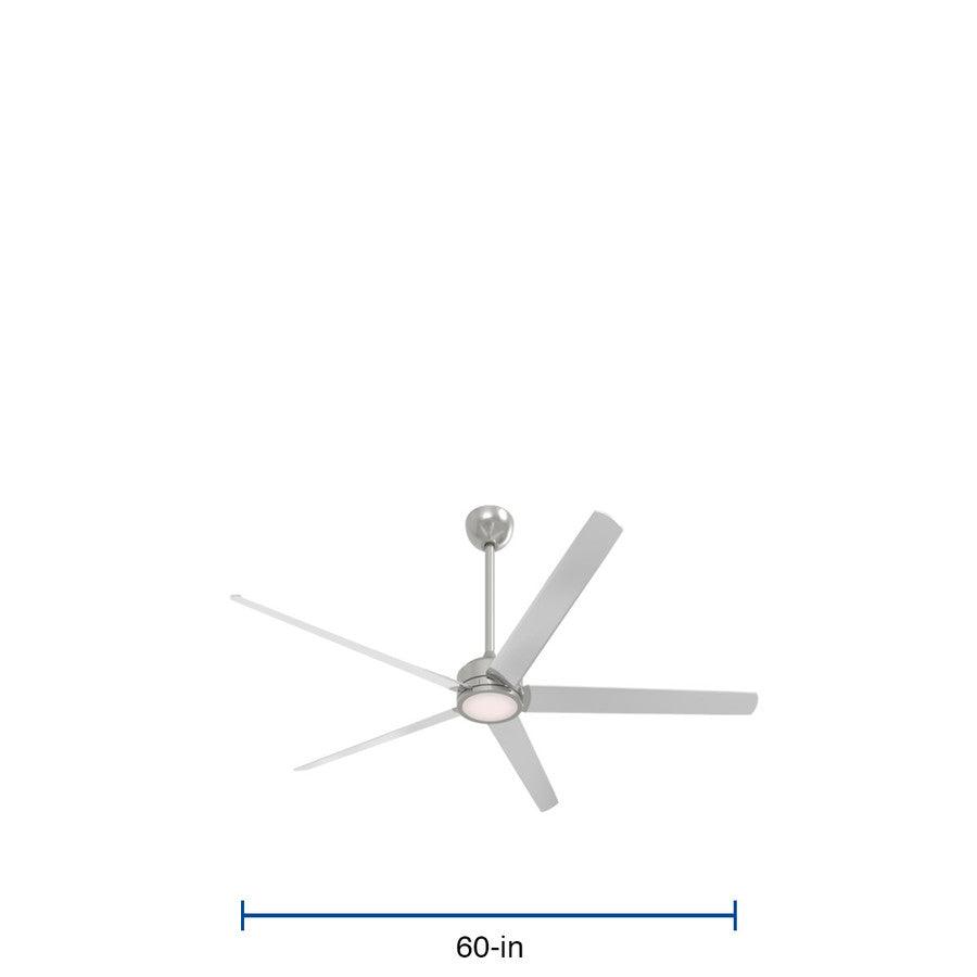 Brushed Nickel finish ceiling fan from the Havenworth collection features 5 silver finish blades Mounts to flat or sloped ceilings with 6-in L downrod included Great for transitional style decor Integrated 20W LED light kit with frosted PC lens with 1100 lumen output 60-In fan provides airflow up to 6,500 CFM, making it ideal for large rooms up to 400-sq ft 6 speed settings make it easy to maintain the ideal comfort level Remote control included, so you can operate the fan and light from anywhere in the room Reverse air flow feature allows you to change the fan's direction setting seasonally, so cool air is pushed down to warm air is distributed evenly ETL Listed