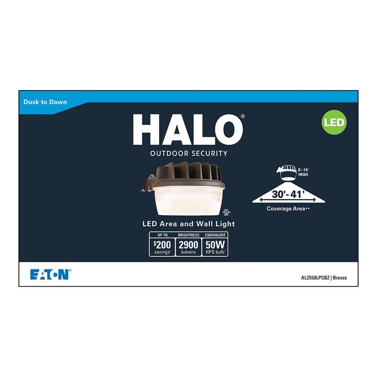 The Halo LED Area and Wall Light with Dusk-to-Dawn photo control incorporate sustainable LED technology into a reliable security solution that provides nighttime ON and daytime OFF settings. This fixture provides the same area coverage as standard 65-Watt CFL, 100-Watt mercury vapor and 200-Watt incandescent area lights while achieving substantial energy and maintenance savings. Perfect for illuminating large areas like barns, side roads and pathways.