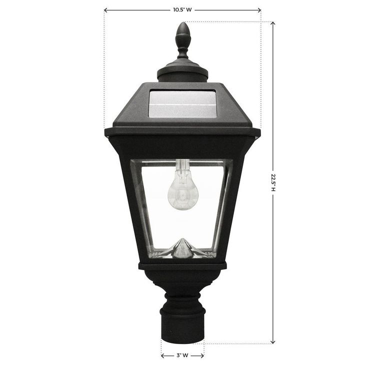 The Gama Sonic Imperial Bulb GS-97B-F is a single lamp head that can be placed on any 3 in. O.D. pole or 3 in. pier/flat base. It is a rust-resistant, cast-aluminum solar lantern which features an attractive 19th-century lamp design and has now been integrated with our latest revolutionary technology: a patented outdoor Solar LED Light Bulb providing 180 Lumens on a full charge. 25 in. tall solar light with a powder-coated black finish and beveled glass pane, the Imperial GS-97B-F solar lamp will add style and distinction wherever it's installed. Easy to install and providing ample light this solar light is the perfect energy and money-saving replacement for electric or gas-powered outdoor lighting. Key Features and Benefits: No Electrical Wiring for Installation Fully solar powered lights 4 integrated solar panels3 in. Fitter Solar Light: Our Gama Sonic solar light will fit on any existing 3 in. Dia pole Rust Resistant Solar Light New Patent Pending LED Solar Bulb Technology: This outdoor LED Solar Bulb Provides 180 Lumens of powerful light on a full charge. Economy mode switch extends nightly light duration Patented cone reflector enhances the glow and multidirectional light dispersal Integrated Lithium-ion battery pack lasts for approximately 3-years (roughly 1000 charges) and can be replaced for additional 3-years of operation. Warning: Gama Sonic solar light bulbs are not to be used in electrical sockets or in other company's solar products.