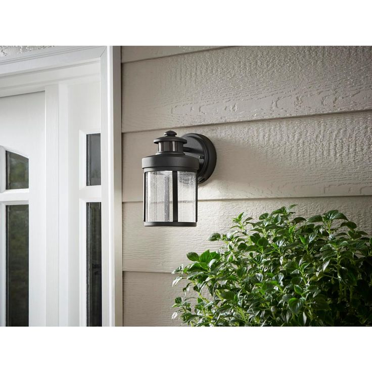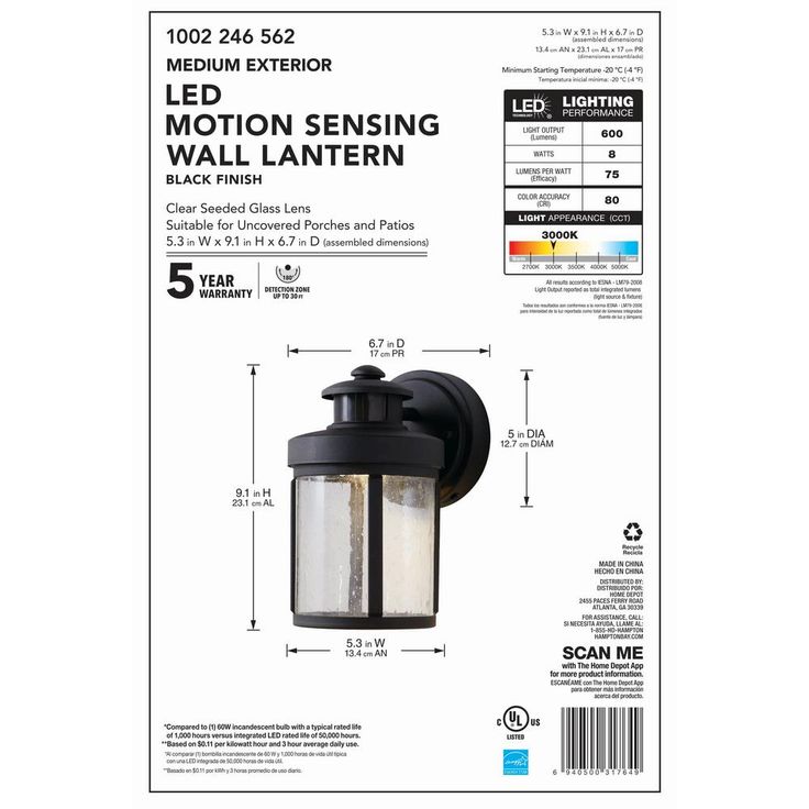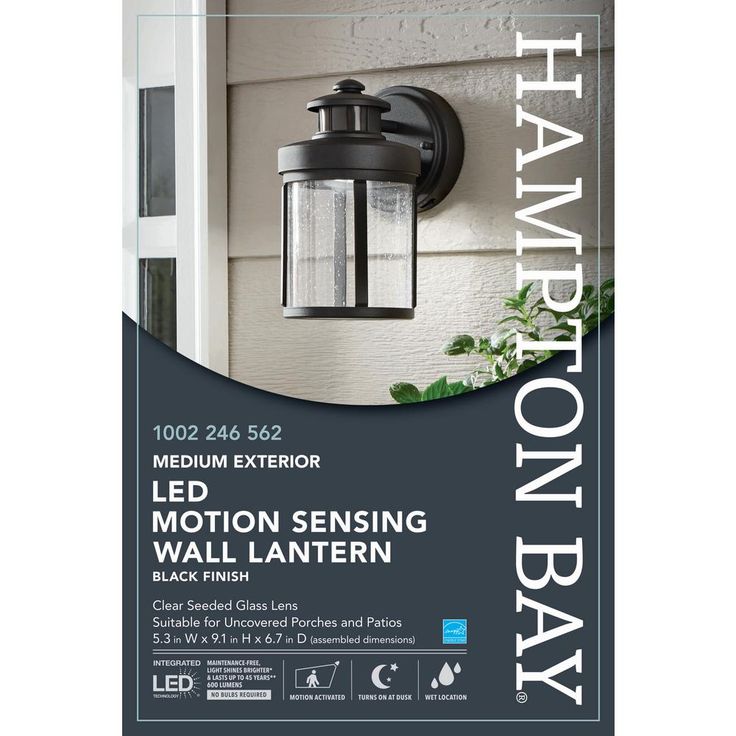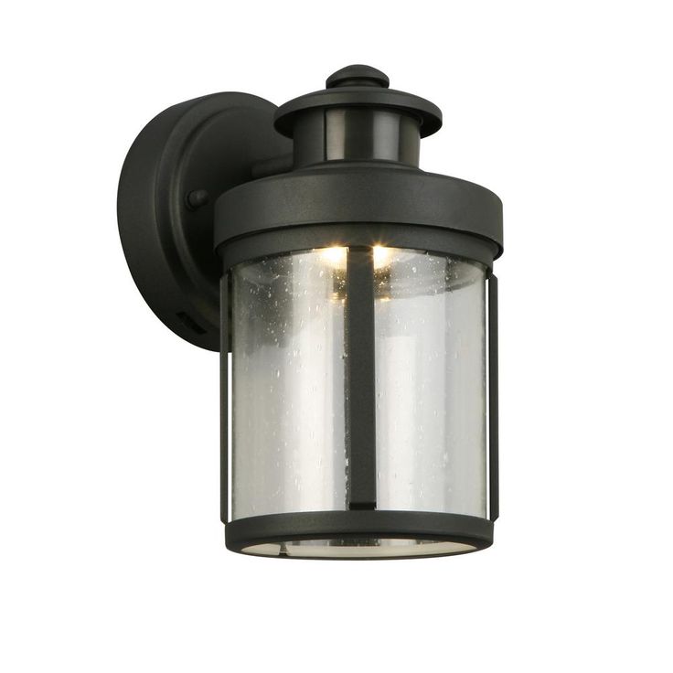 Featured is a traditional exterior wall lantern. This design has a rustic black finish with seedy glass. It is equipped with energy saving LEDs. With 600 Lumens output, 3000K bright white light and 50,000 hours of life, it is a great energy saver. It also contains a motion sensor with 180 degree range and 30 ft. detection. It can be adjusted for sensitivity in detection and length of time it remains illuminated. It also has a dusk-to-dawn feature so you can override the motion sensor allowing the light to remain on during the night.